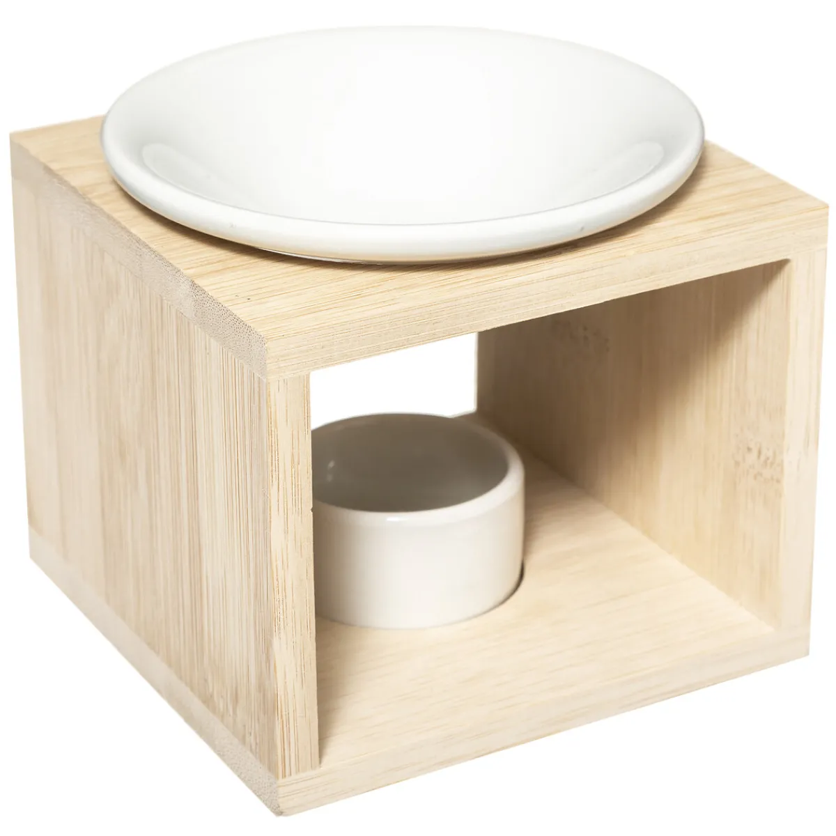 Ce brûle-parfum se distingue par sa structure carrée en bois. Dessus, un récipient en céramique est destiné à accueillir de l’huile parfumée. Vous pourrez ajouter une bougie chauffe-plat dans la partie inférieure, dotée d’un emplacement en céramique. Avec son petit format de 11,5 x 11,5 cm, il trouvera sa place sur un meuble comme sur une étagère.
