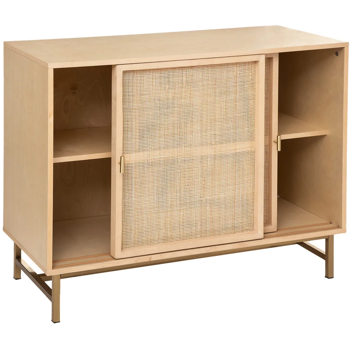 La silhouette brute de ce meuble est adoucie par l’alliance chaleureuse du cannage en rotin et du bois. Les pieds en métal doré apportent quant à eux une touche contemporaine qui confère à l’ensemble un style sophistiqué.