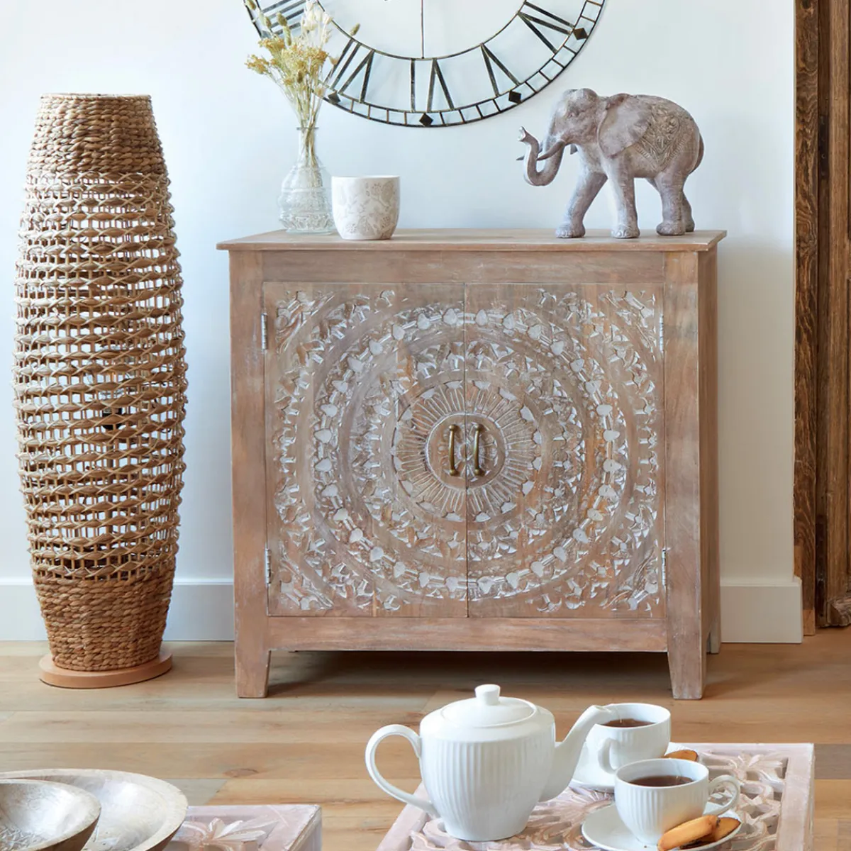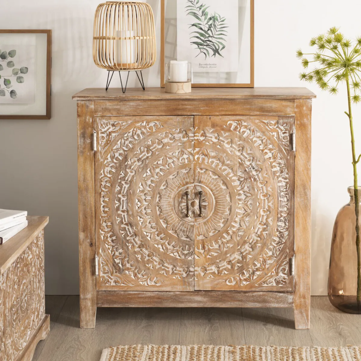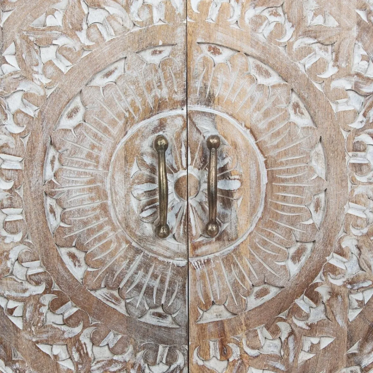 Ce buffet est composé de deux portes sculptées à la main en Inde et réalisées en bois de manguier. C’est une matière résistante, pour assurer la longévité de votre meuble, appliquez une huile transparente protectrice. Elle s’entretient ensuite avec un chiffon sec. À l’intérieur, ce buffet dévoile deux larges étagères pour ranger vos affaires.