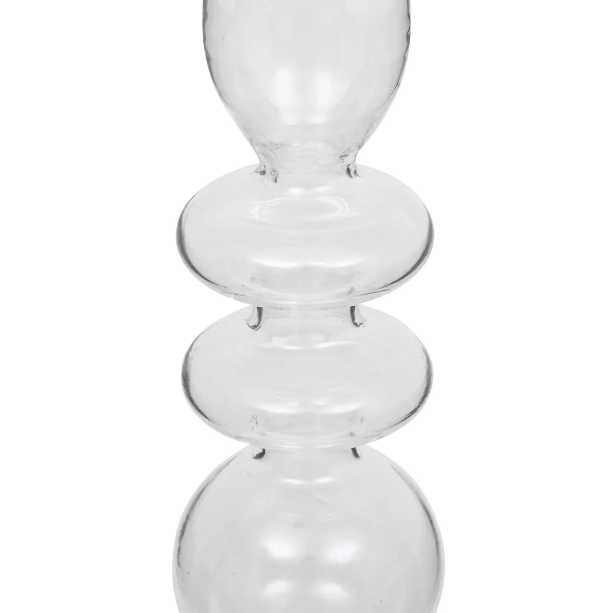 Entièrement réalisé en verre soufflé, ce chandelier obéit à des dimensions standards ainsi qu’à une ligne sophistiquée, marquée par une série de boules en relief. Il accueillera les bougies bâtons de votre choix, colorées ou non, pour un bel effet sur une console comme au centre d’une table à manger. Il se mariera volontiers avec du linge de table imprimé d’inspiration art déco.
