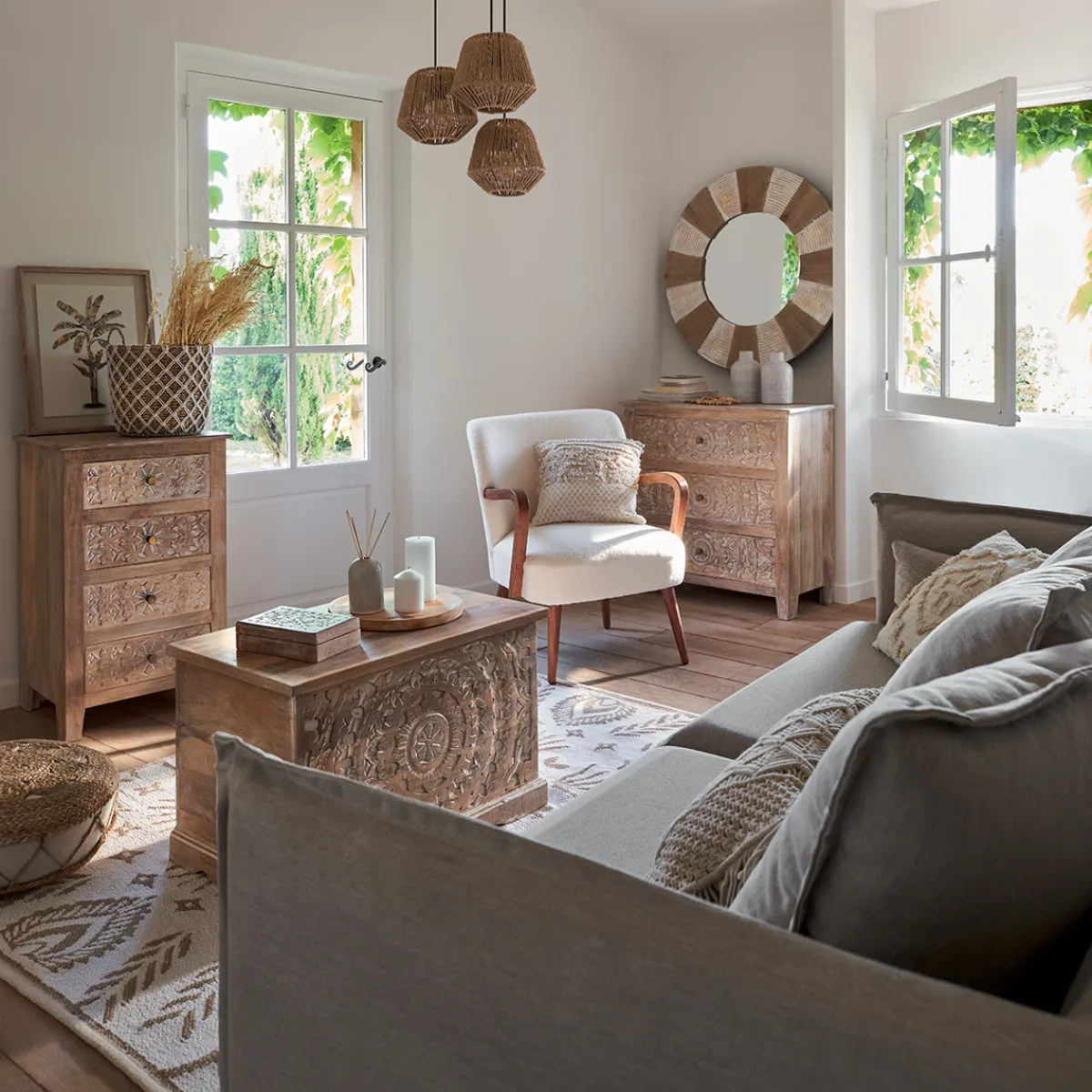Pratique avec ses quatre tiroirs, le chiffonnier « Shirel » donnera à votre intérieur un style bohème. Composé d’une structure en bois de manguier, sculpté à la main en Inde, notre chiffonnier vous plaira par son aspect brut et naturel.