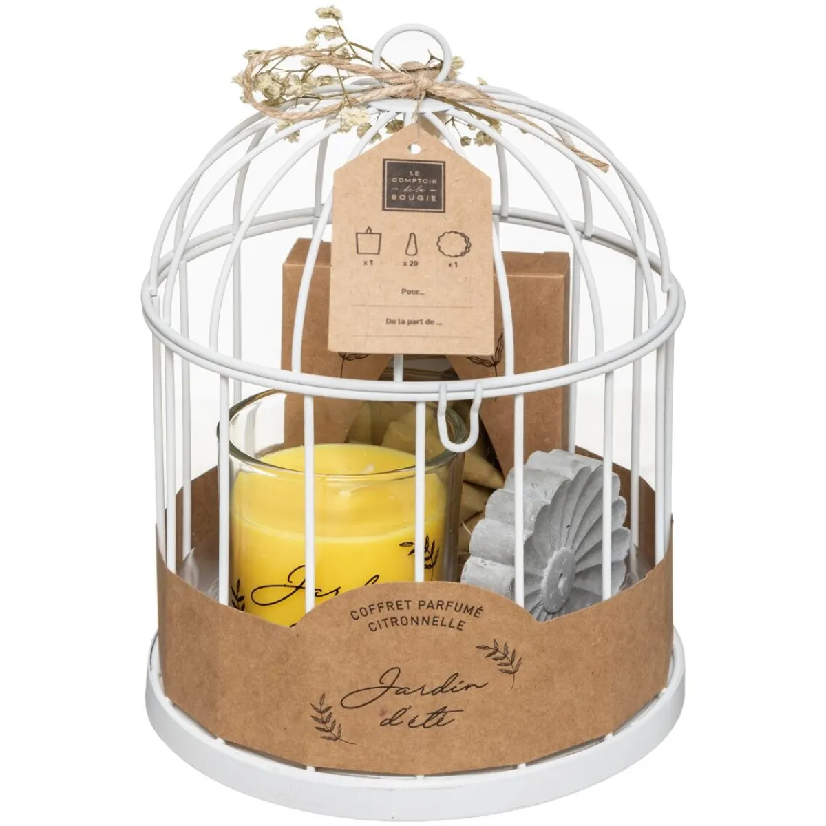Telle une évasion sous les tropiques, la bougie* et les cônes diffusent un parfum de citronnelle. En plus du récipient à bougie en verre, ce coffret contient un support en ciment qui servira à la fois de porte-encens et d’attrape-cendres. Le tout est présenté dans une jolie cage en métal ornée d’un noeud en corde et d’une fleur séchée.