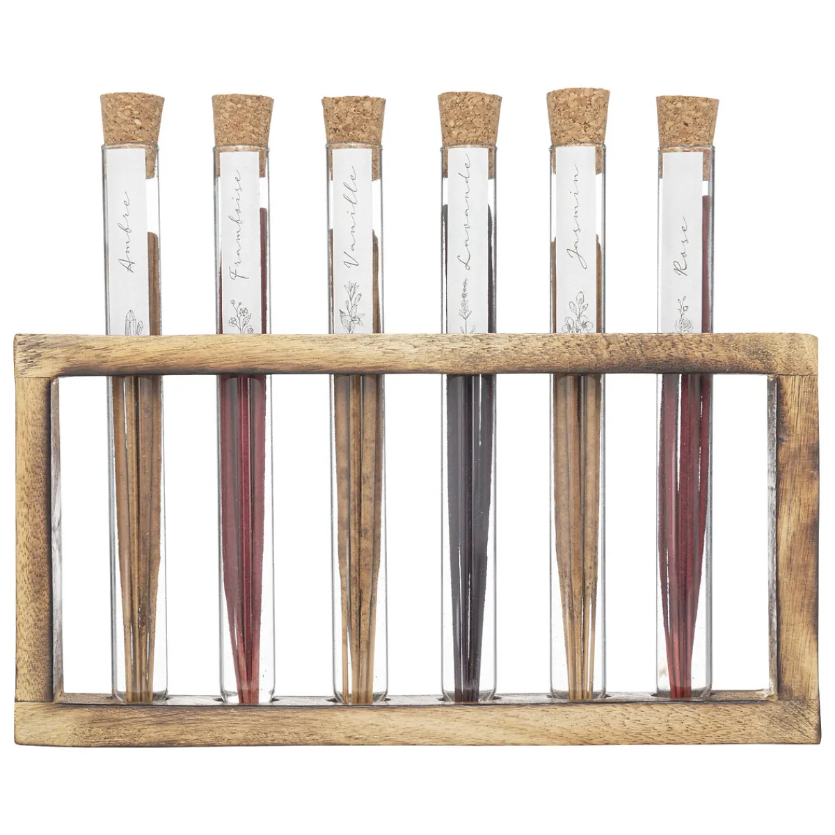 Le coffret « Namasté » se distingue par son support en bois de manguier dans lequel sont placés 7 tubes contenant des encens aux parfums variés. Réalisés en verre et fermés par des bouchons en liège, chaque tube contient plusieurs bâtonnets colorés qui feront souffler un vent d’évasion dans votre déco, une fois placés dans le support en métal!