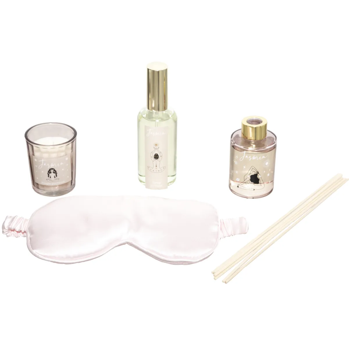 Cadeau idéal quand les nuits sont trop courtes, ce coffret de senteurs comprend 1 masque de nuit satiné, 1 diffuseur d’huiles essentielles à tiges, 1 spray d’ambiance parfumé et 1 bougie* en verrine avec parfum au choix.