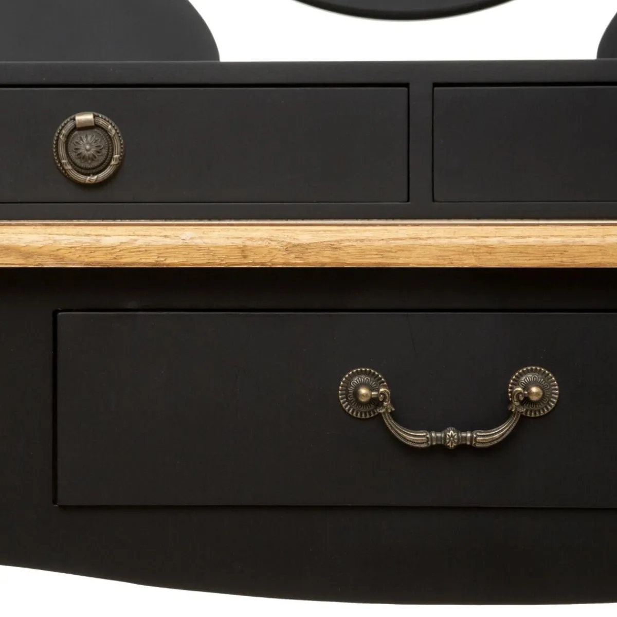 Cette coiffeuse a tout pour plaire, à commencer par ses pieds galbés en bois de pin. Ses tiroirs aux poignées joliment travaillées et son miroir ovale la complètent pour créer un ensemble harmonieux.