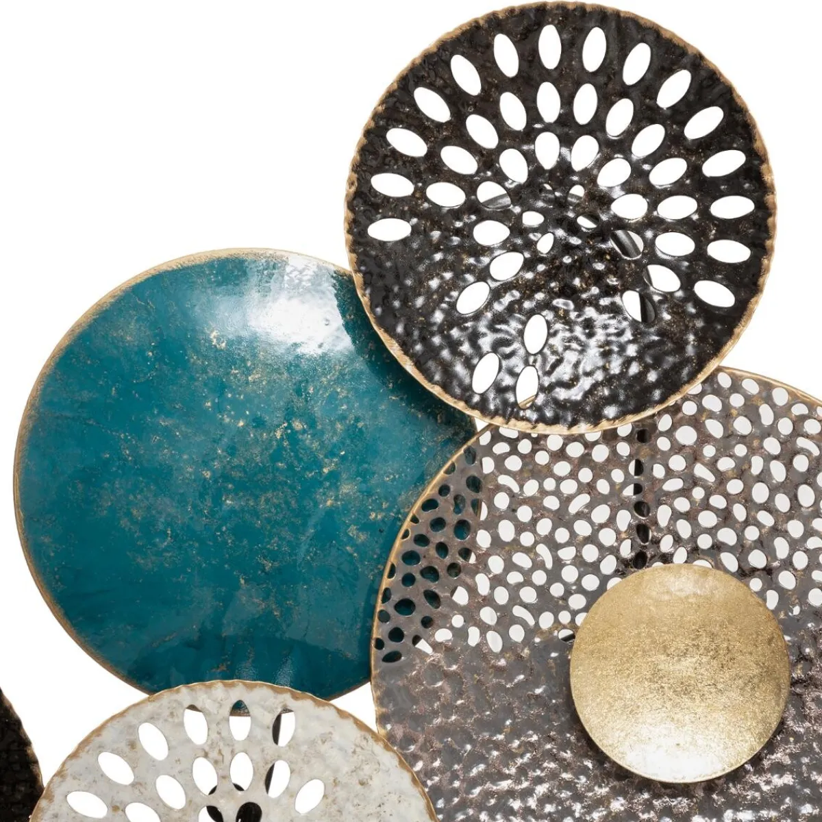 Composée d’un ensemble de disques en métal, cette pièce sculpturale viendra habiller séjour, hall d’entrée ou chambre à coucher. Disques ajourés ou poinçonnés, chaque élément est finement travaillé. Le choix du métal brut donne un cachet unique à l’oeuvre et à votre intérieur.