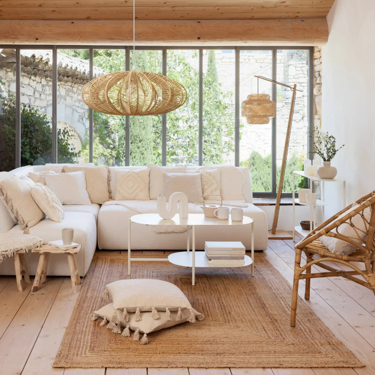 Choisissez des bouts de canapé aux détails glamour pour entourer votre chauffeuse et éclairez votre pièce avec un lampadaire en métal.