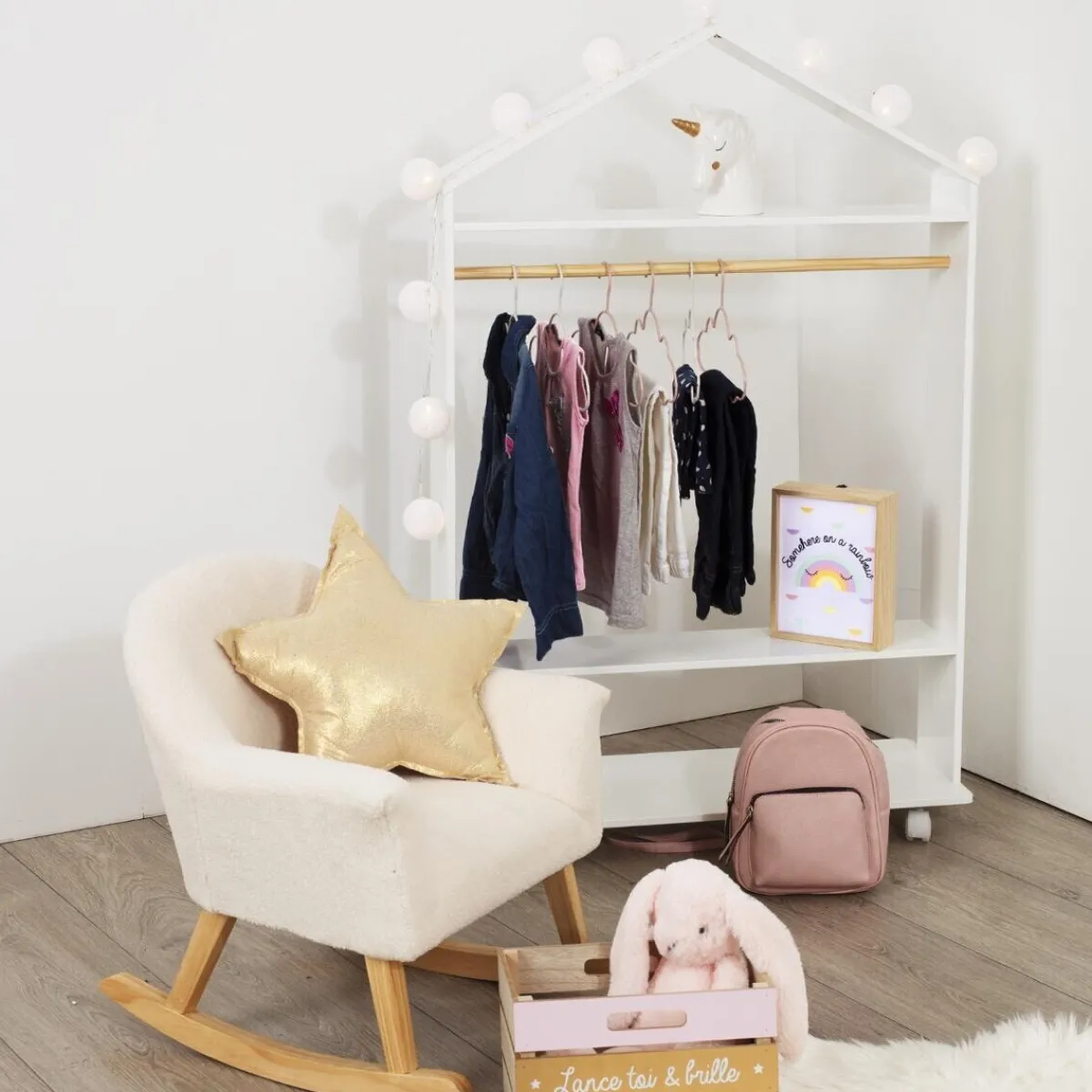 Avec son panneau supérieur prenant la forme d’un toit, cette penderie ressemble à une petite maison. Elle apportera une touche cosy dans la déco d’une chambre d’enfant et son coloris uni permet de l’associer facilement à d’autres meubles.