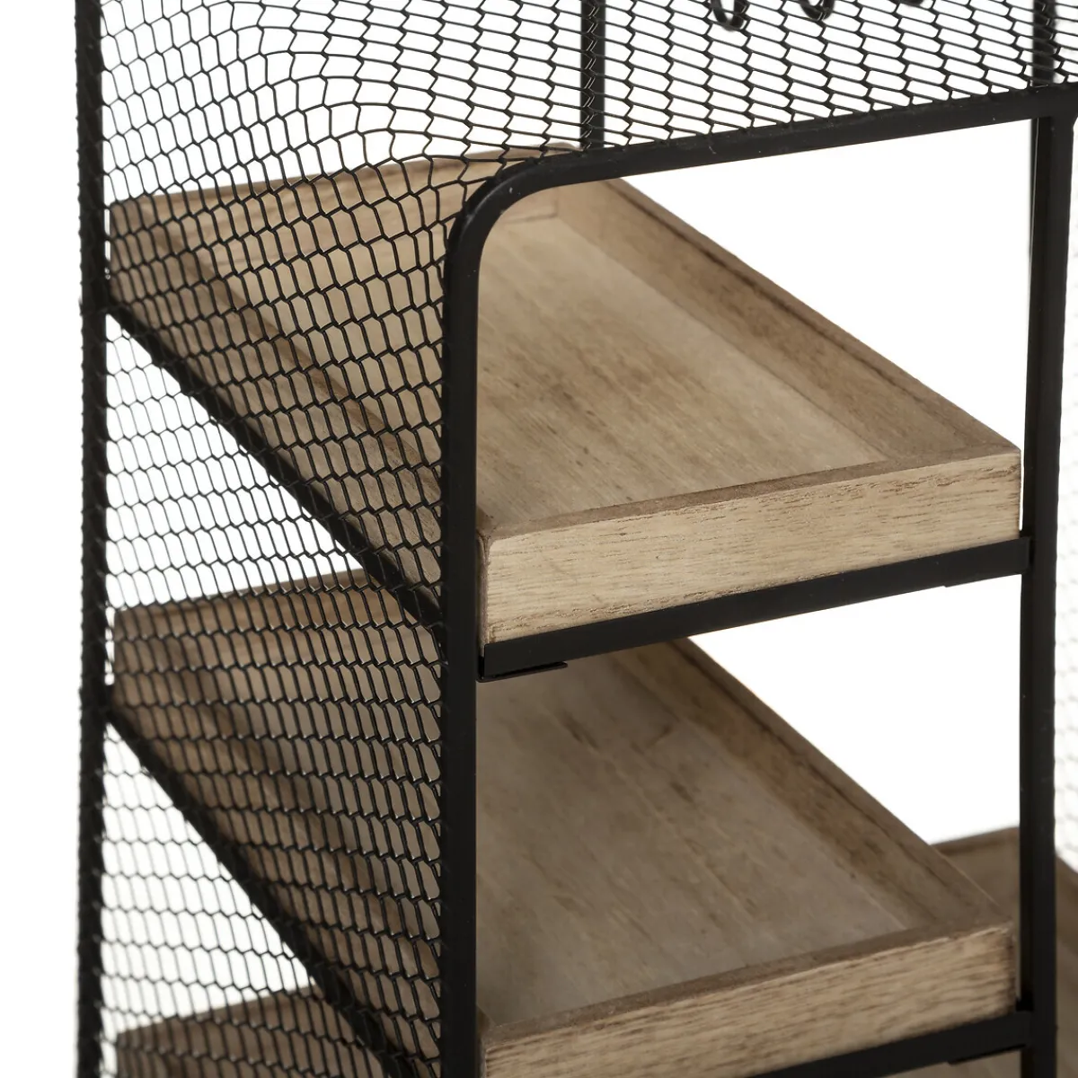 Avec ses dimensions généreuses, ce porte-bijoux « Arty » vous permettra de ranger vos bijoux avec style! Réalisé dans un mélange de bois et de métal grillagé, il dispose de 4 étagères et de 8 crochets pour suspendre vos colliers. Idéal dans une chambre à coucher, il se mariera volontiers avec du bois.