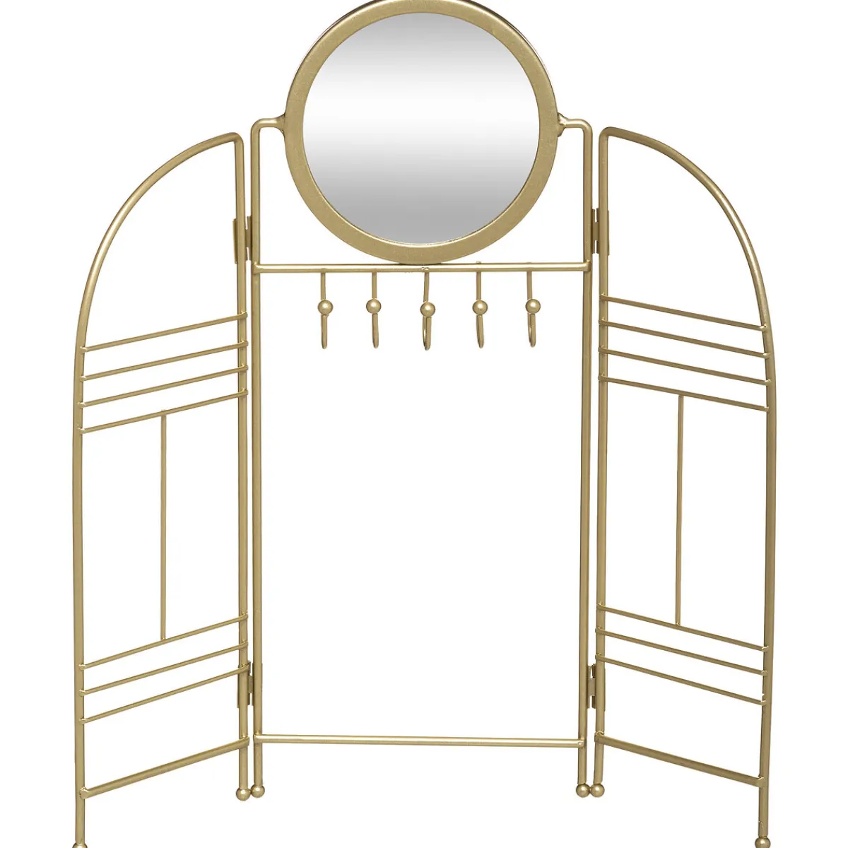 Pensé comme un mini paravent, ce porte-bijoux « Feel » en métal est composé de trois parties pivotantes qui vous permettront de l’ouvrir et de le fermer à l’envi. Les barres transversales accueilleront bracelets et boucles d’oreilles, 5 crochets étant prévus pour suspendre chaînes et colliers. Avec son miroir et sa hauteur de 33 cm, c’est un objet chic et accessible.