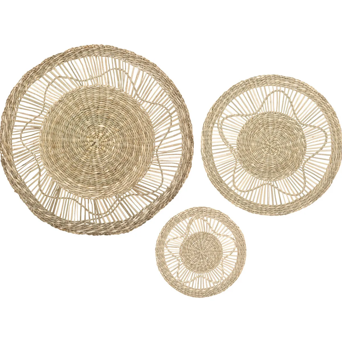 Cette déco murale seagrass a été conçue en roseau ce qui lui confère beaucoup de caractère. Au nombre de 3, ces décorations murales présentent des diamètres différents de 18 cm, 28 cm et 38 cm. Disposez-les harmonieusement en quinconce, les unes au dessus des autres ou en enfilade horizontale. À vous de voir selon vos goûts.