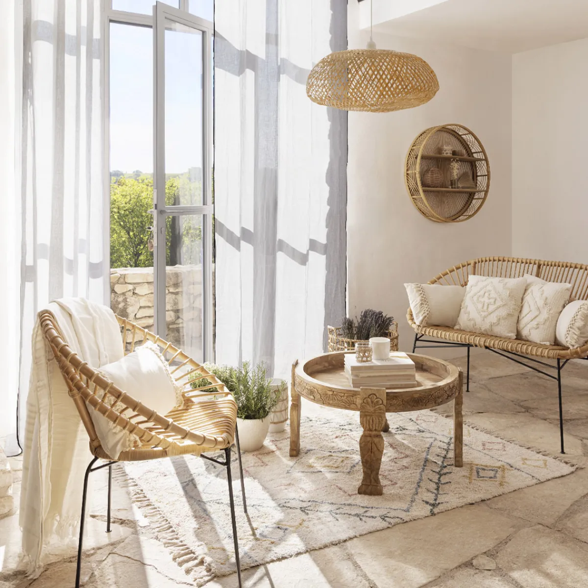 Installez votre suspension « Beddy » au-dessus d’une table à manger Atmospheraen bois d’acacia et profitez d’un ensemble chaleureux.
