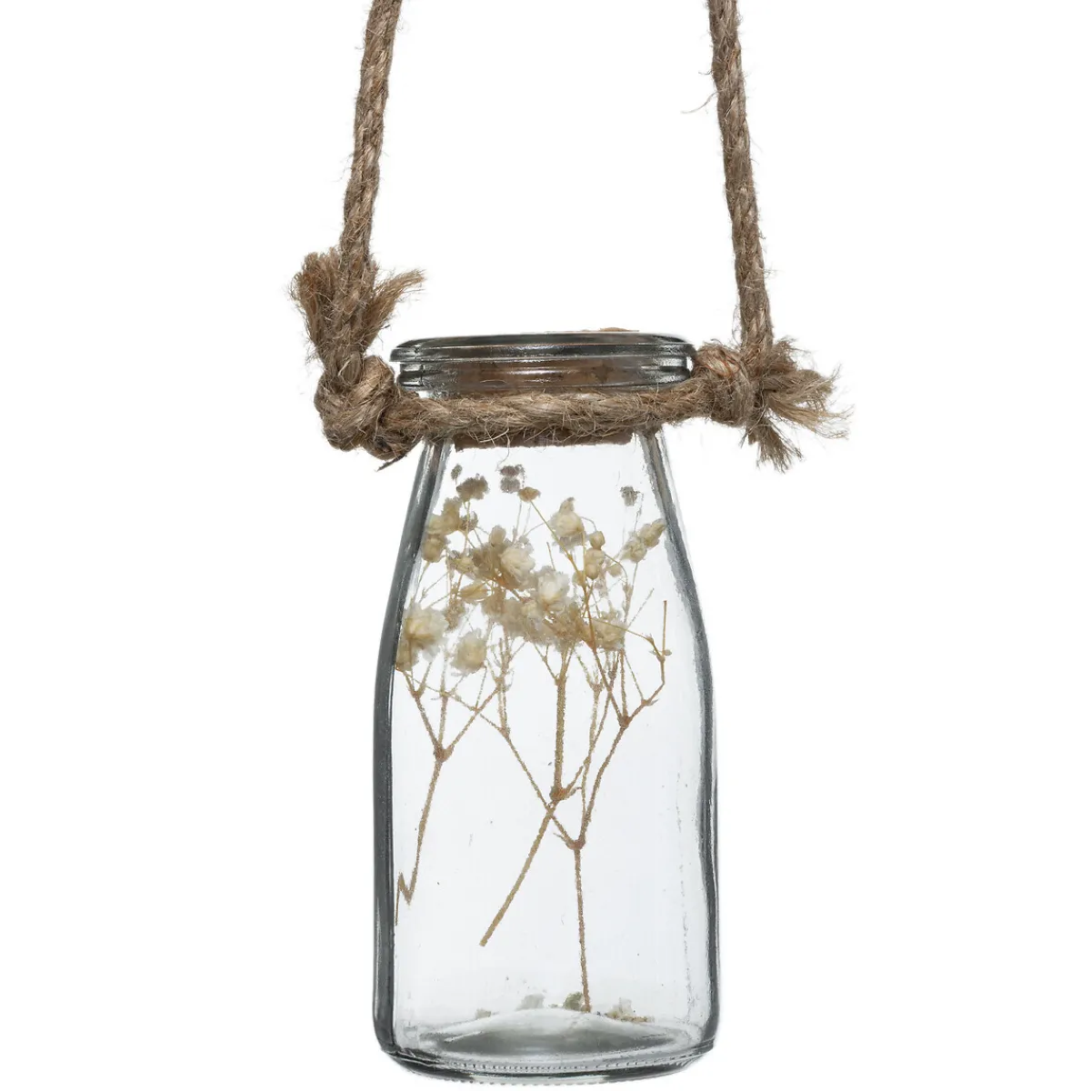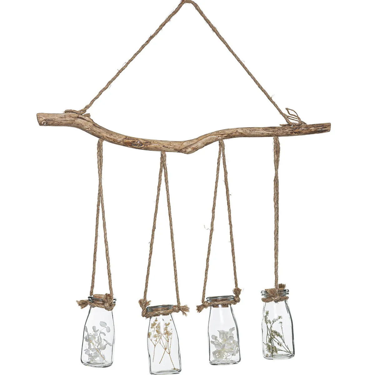 Ce suspension de 4 fleurs sechées présente 4 flacons en verre transparents, reliés à une branche de bois par des cordes en chanvre. Chaque flacon accueille des fleurs naturelles séchées et la branche peut ensuite être suspendue grâce à une corde. Très authentique, cet ensemble poétique et délicat apportera une note très douce dans votre univers!