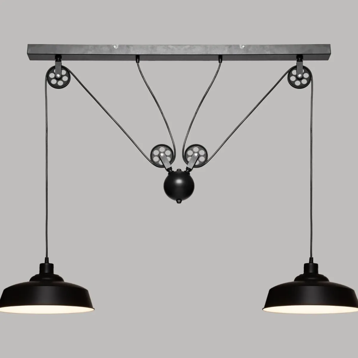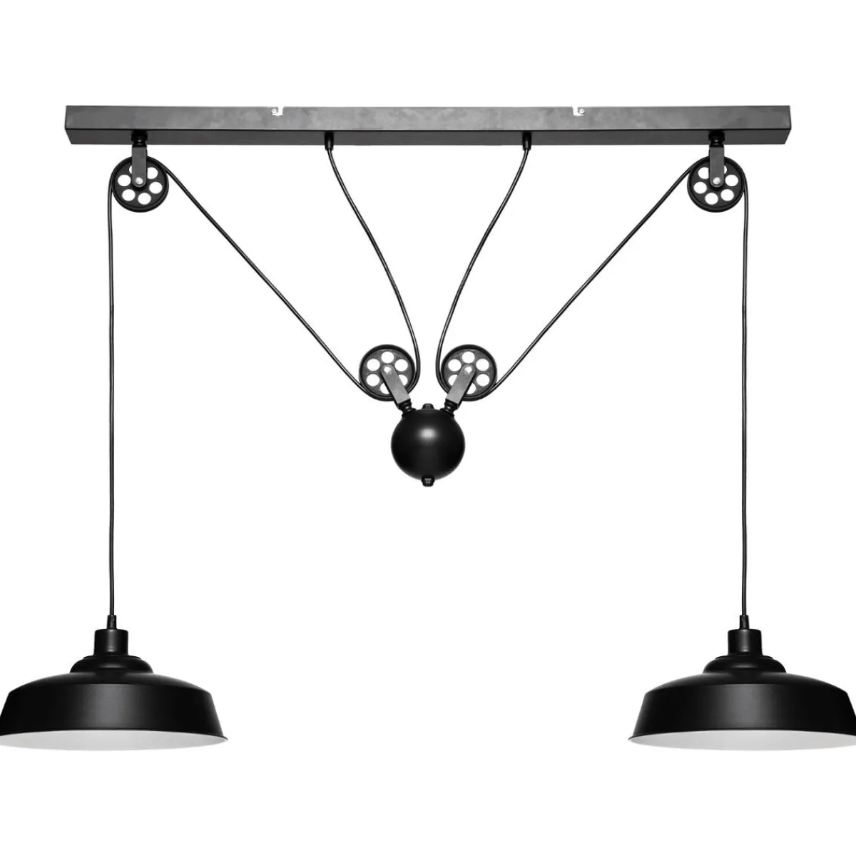 Ce luminaire dispose de deux abat-jour en métal. La hauteur de ces derniers se règle grâce à un système de poulies. Esprit récup’ assuré dans votre intérieur !