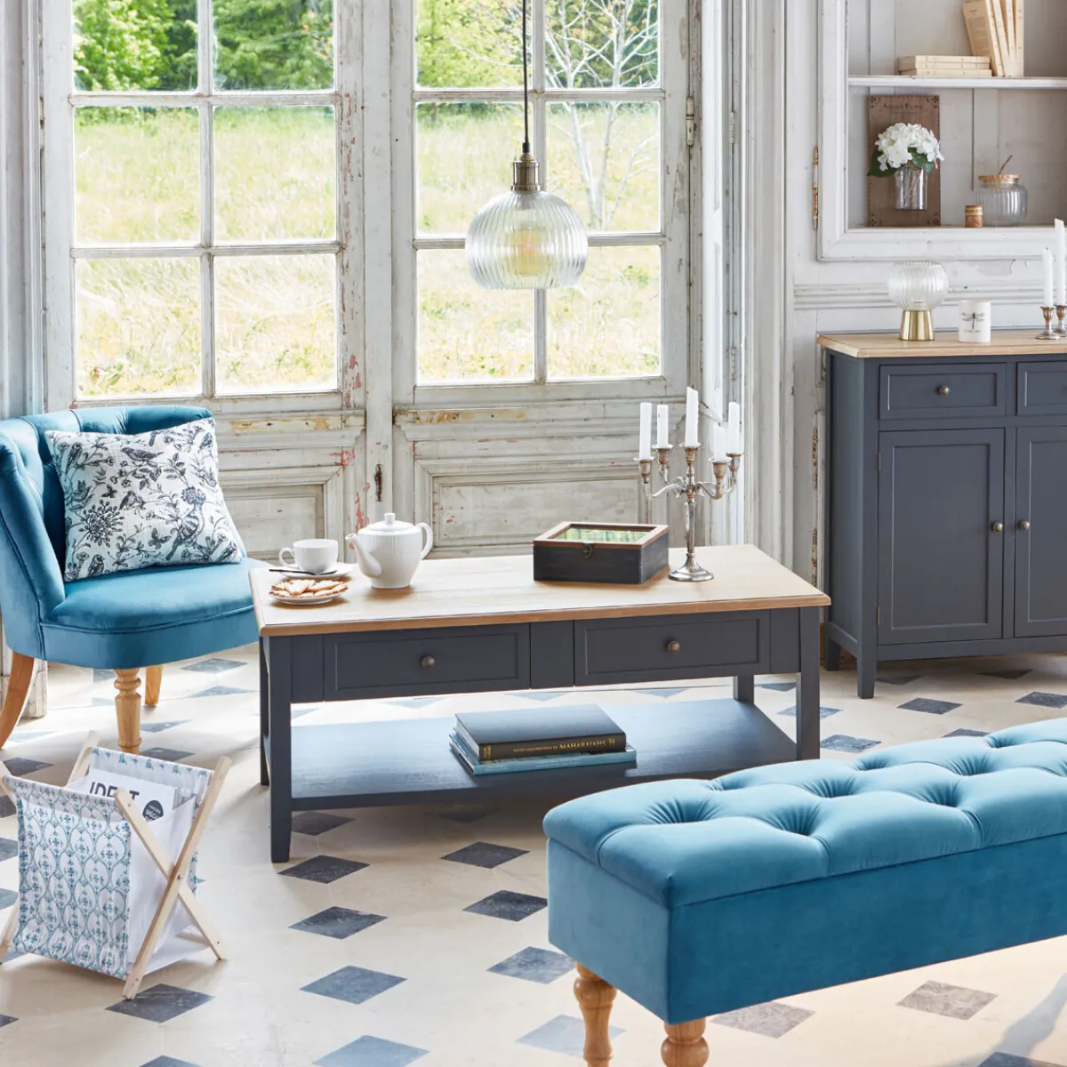 Dans le salon, la suspension « Laye » saura sublimer une table basse en bois peint aux nuances poudrées Atmosphera, autour de laquelle un fauteuil coloré et une banquette rembourrée prendront place.