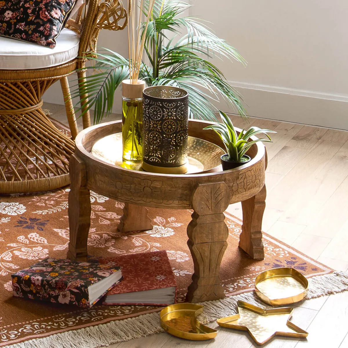 Cette table ronde et compacte se mariera avec des intérieurs modernes ou plus rustiques. Avec ses pieds dessinés et son plateau en bois de manguier, la table à café « Gypsy » donnera une touche romantique à votre espace.