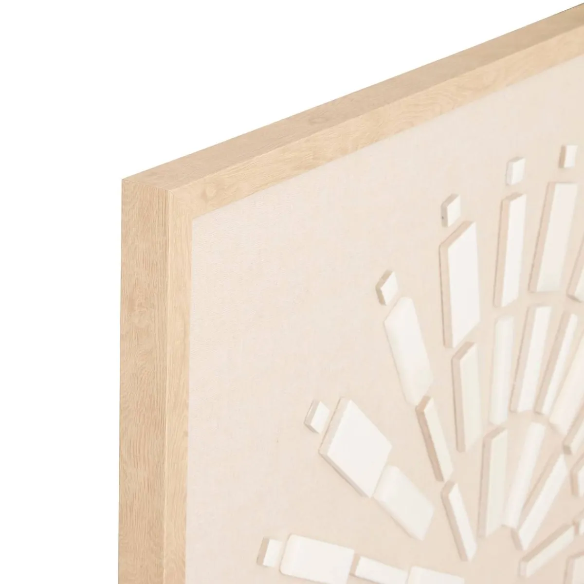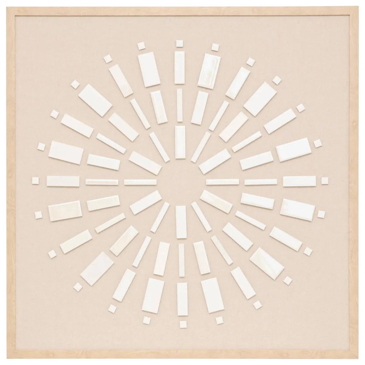 La toile en relief Houria arbore un tissu en lin qui valorise des motifs en céramique qui forment comme un soleil. Le tout est sublimé par un cadre en bois certifié FSC®. Cette toile carré donnera vie à un séjour accrochée au-dessus d’une console en bois ou en rotin Atmosphera.