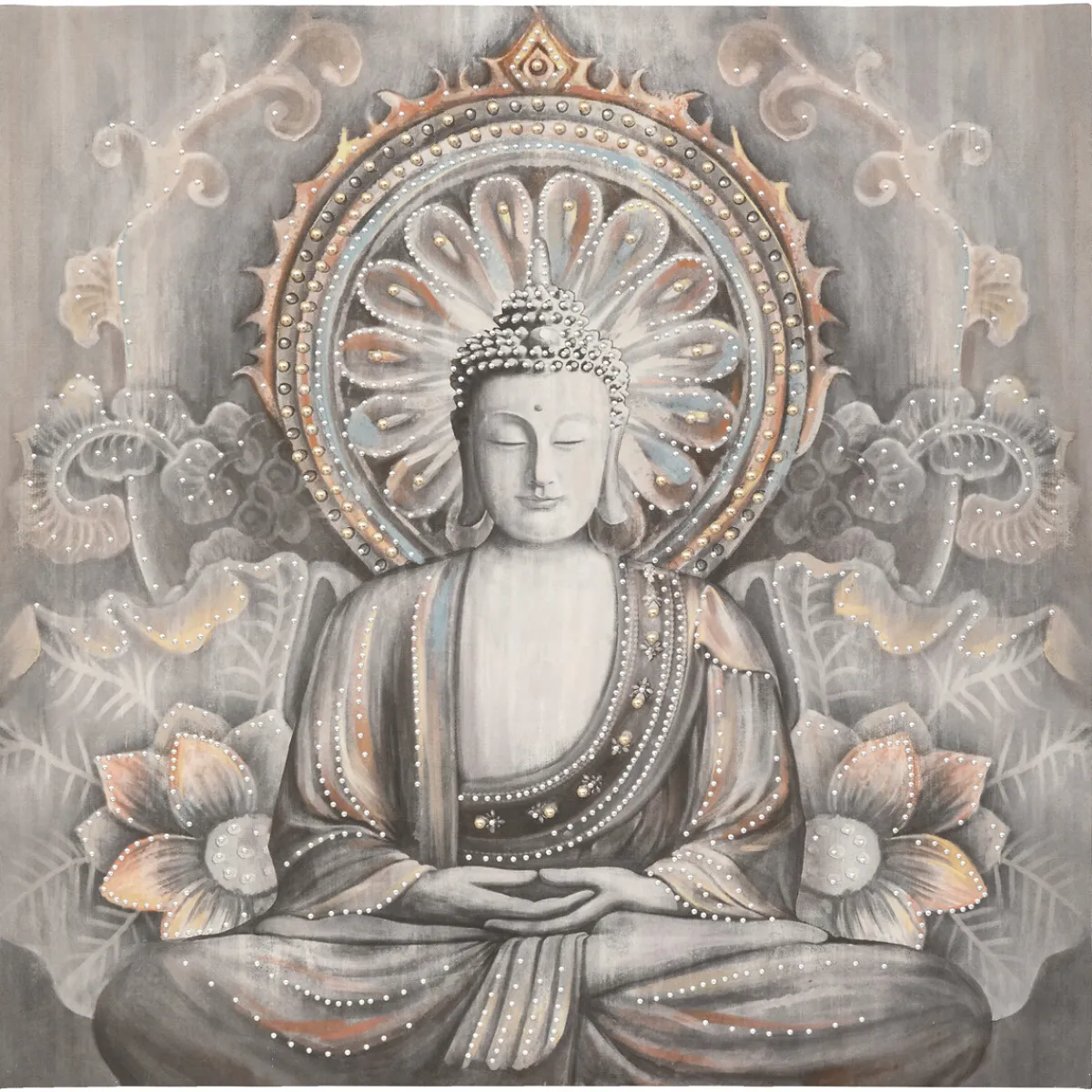 Fixez votre toile imprimée « Bouddha » au-dessus d’un buffet en bois de manguier Atmospheraet évadez-vous dans votre salon!