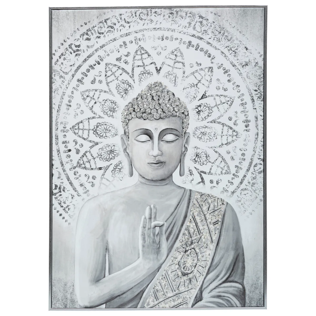 Installez votre toile imprimée « Bouddha » au-dessus d’un buffet en bois de manguier Atmospheraet évadez-vous dans votre salon!