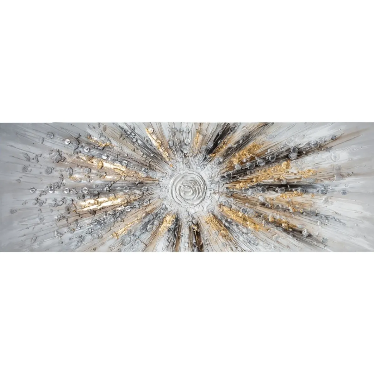 Décorée de bulles et de projections de peinture métallisée en cercle, cette peinture sur toile rectangulaire représente un astre en fusion. De style contemporain chic, la toile sur châssis « Kylia » sublimera votre pièce.