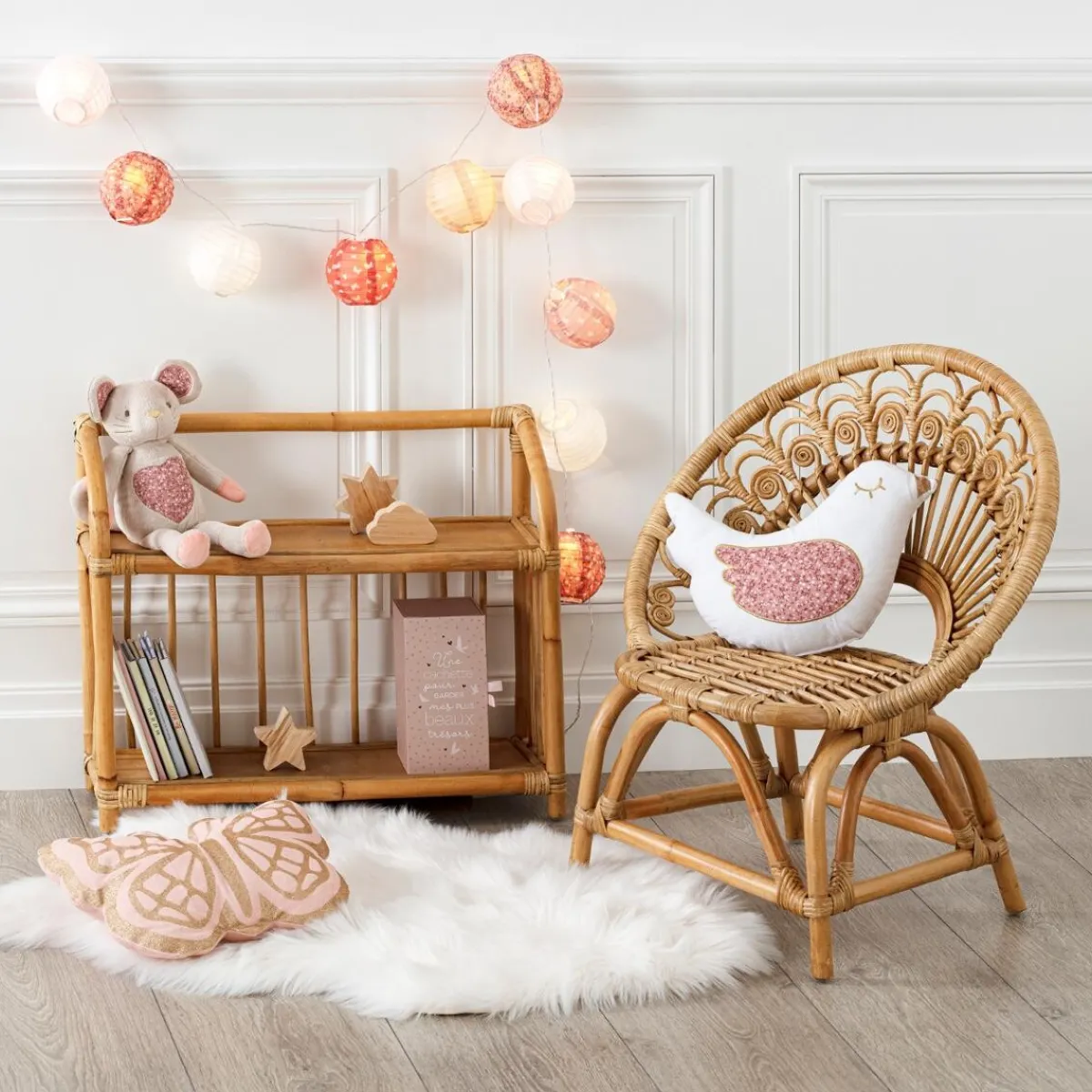 Cette bibliothèque basse s’harmonisera avec un fauteuil en rotin Atmosphera for kids.