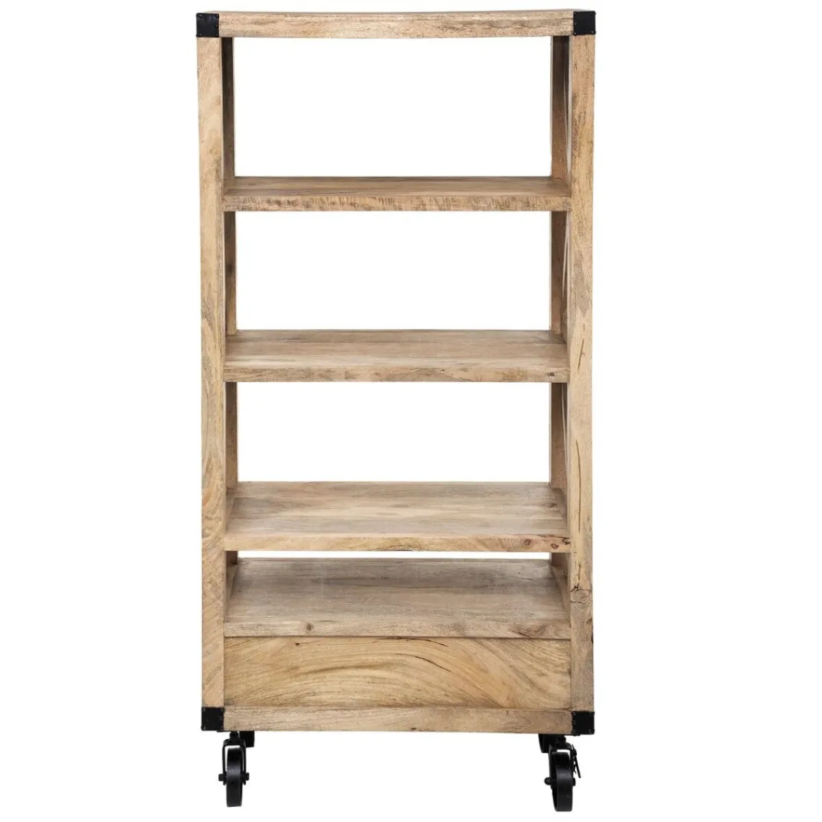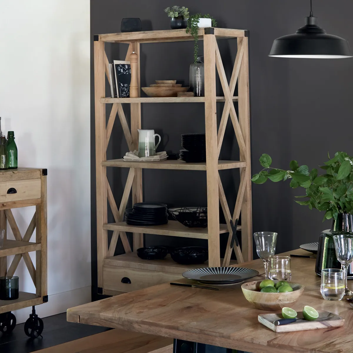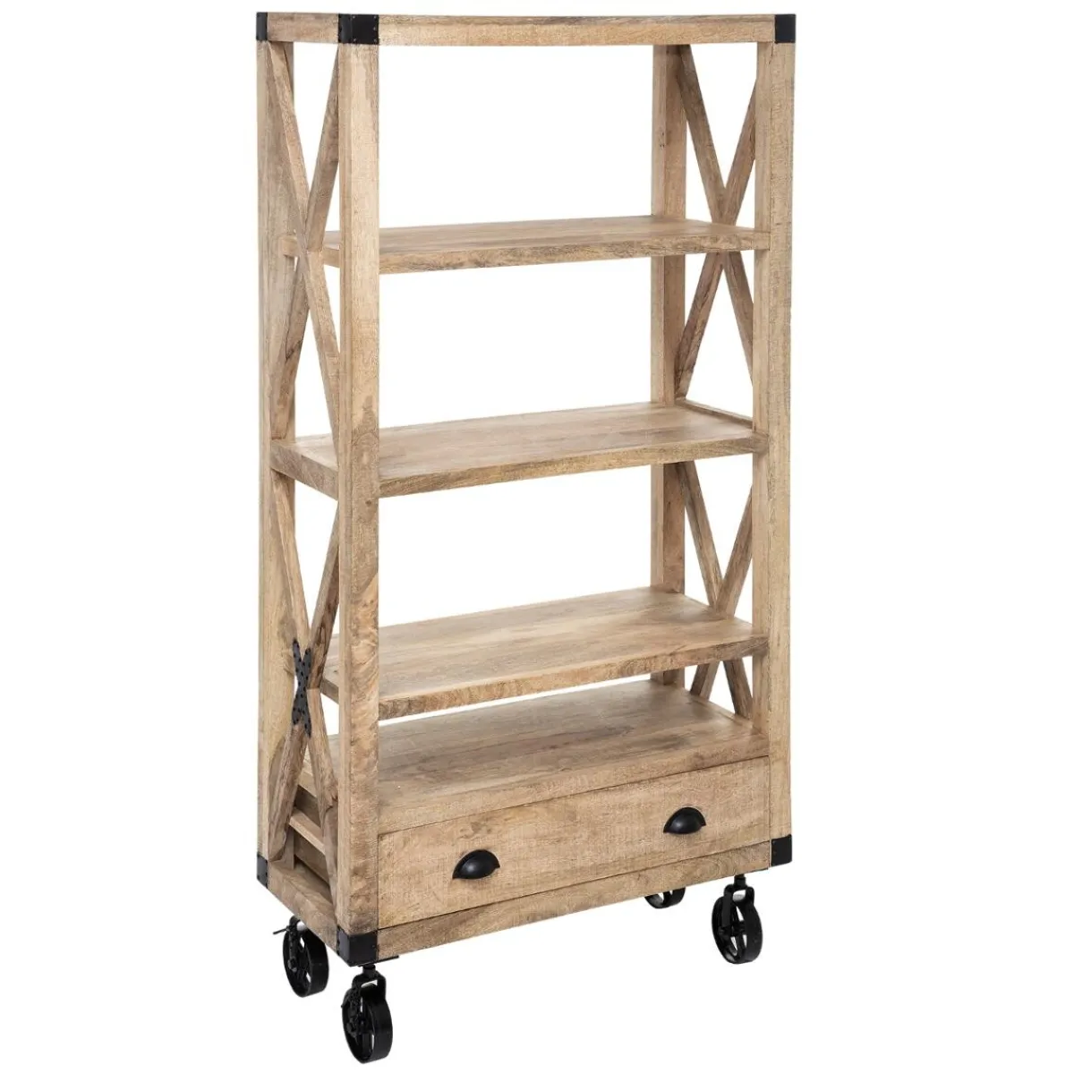 Dotée d’une structure en bois décorés de coins en acier, cette bibliothèque en manguier robuste est composée d’un large tiroir bas et de 4 étagères. Les poignées coquilles du tiroir et ses roues en métal lui offrent un style industriel tendance.