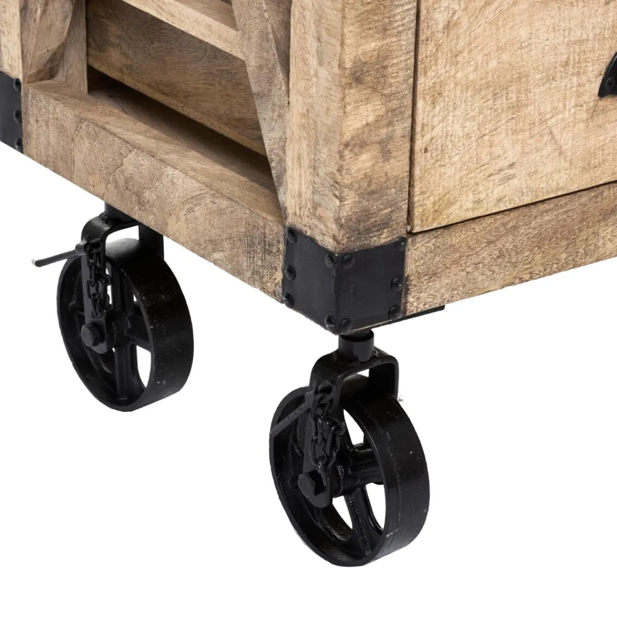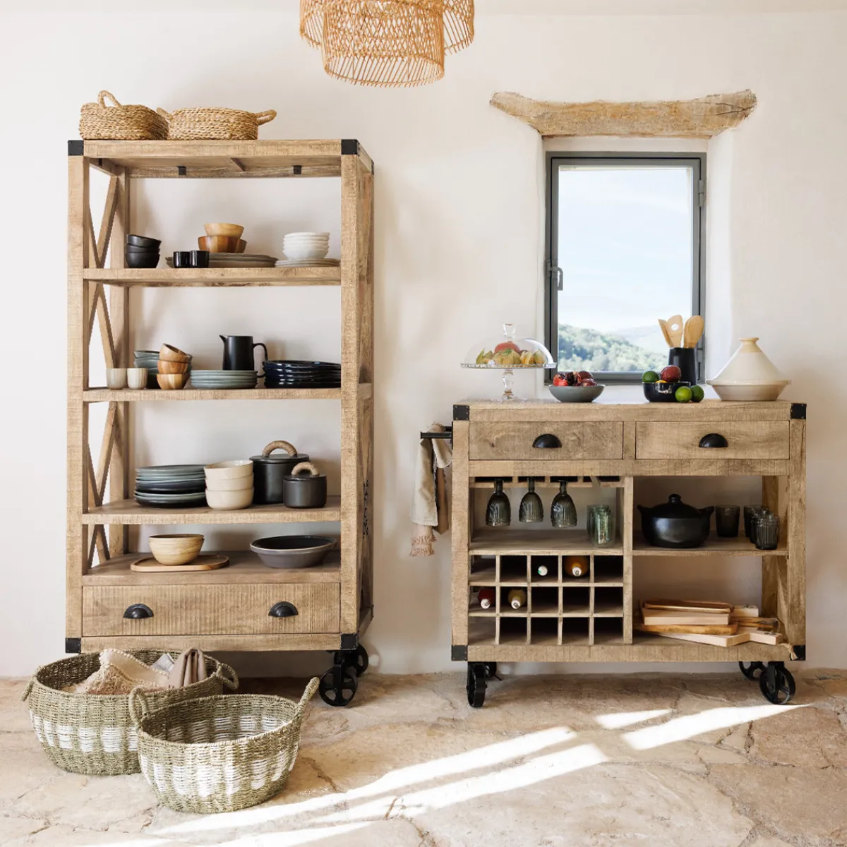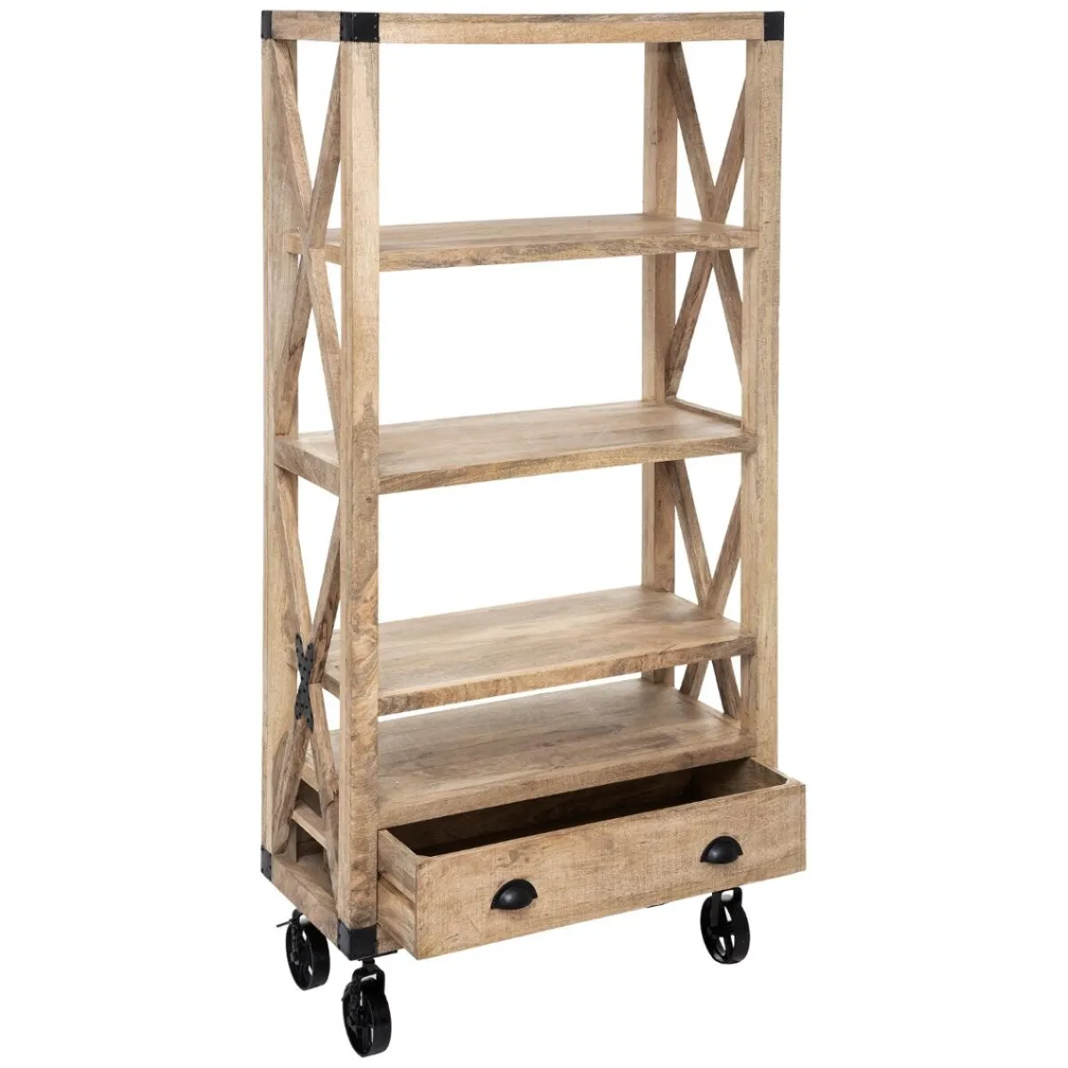 Dotée d’une structure en bois décorés de coins en acier, cette bibliothèque en manguier robuste est composée d’un large tiroir bas et de 4 étagères. Les poignées coquilles du tiroir et ses roues en métal lui offrent un style industriel tendance.