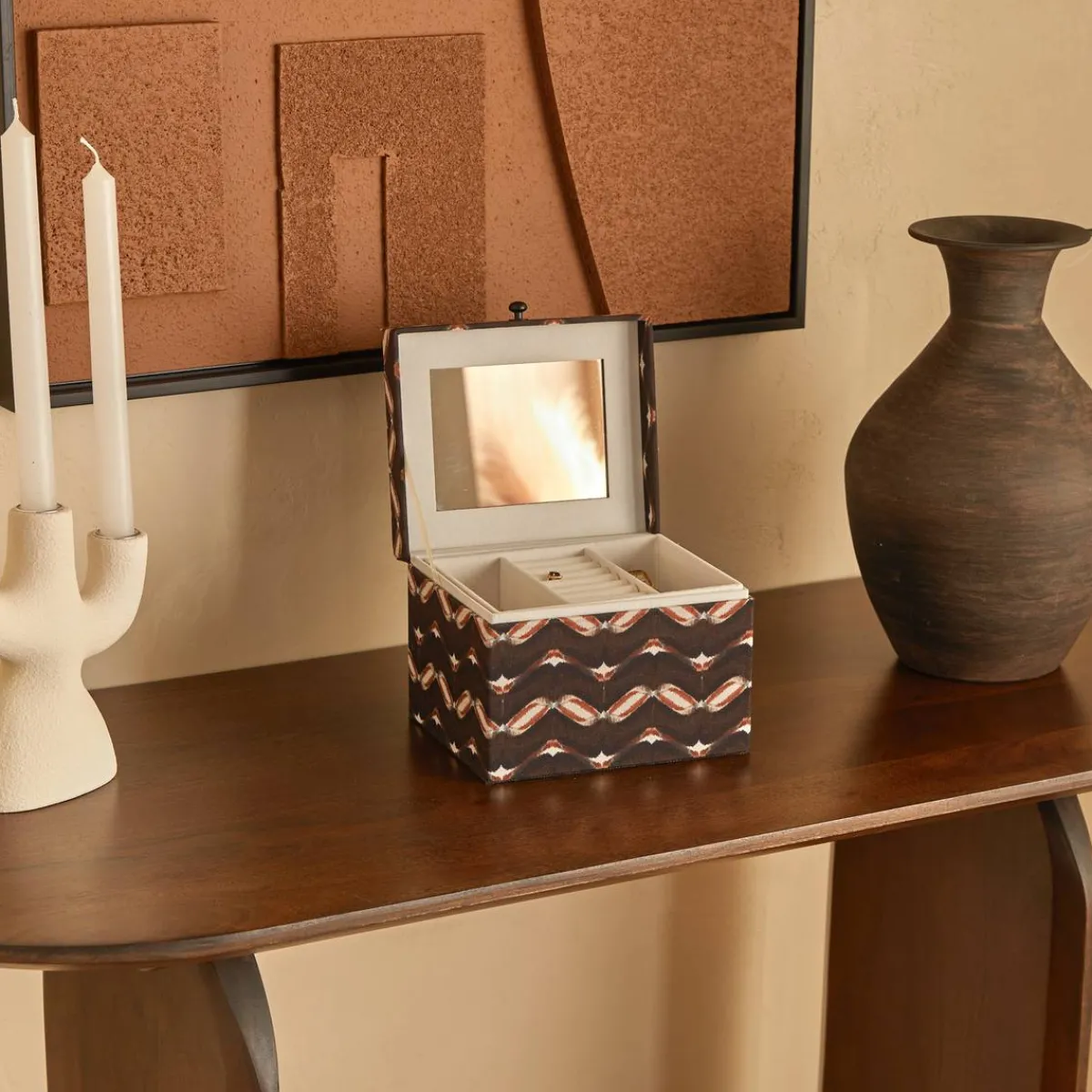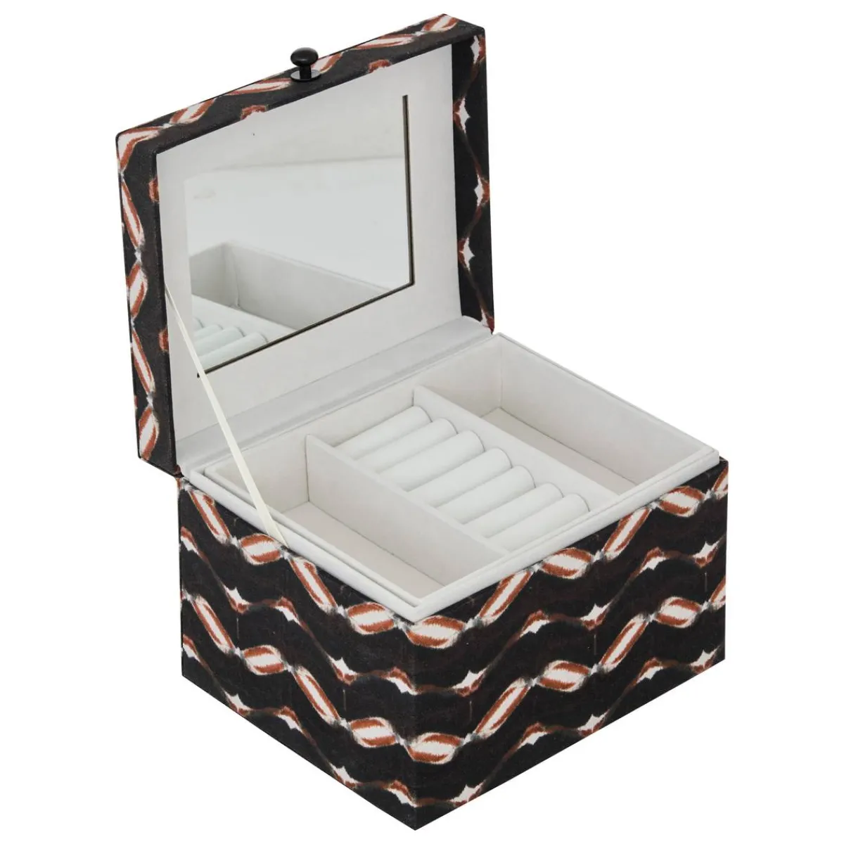 D’un format rectangulaire, la boîte à bijoux Wonja Atmosphera est entièrement tapissée d’un tissu imprimé aux accents ethniques. À l’intérieur, un miroir figure au dos du couvercle et deux plateaux superposés vous permettront de ranger l’intégralité de vos bijoux grâce à 9 compartiments ainsi qu’à des emplacements pour bagues et boucles d’oreilles. Cette boîte à bijoux relativement compacte trouvera sa place sur une commode en bois et elle se déplace facilement au gré des besoins.