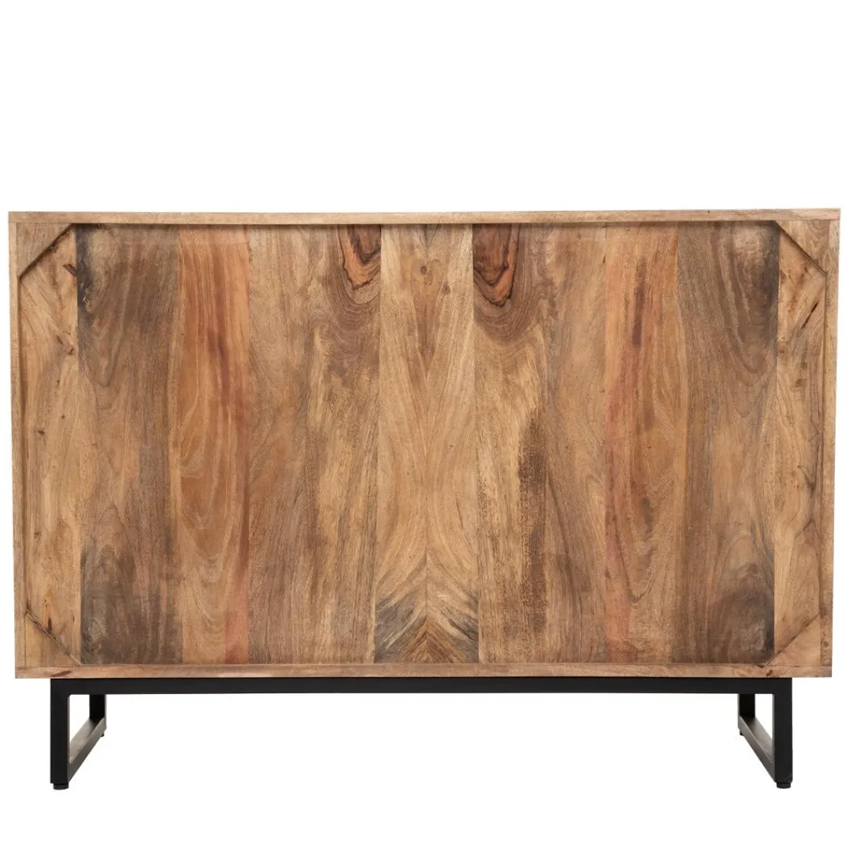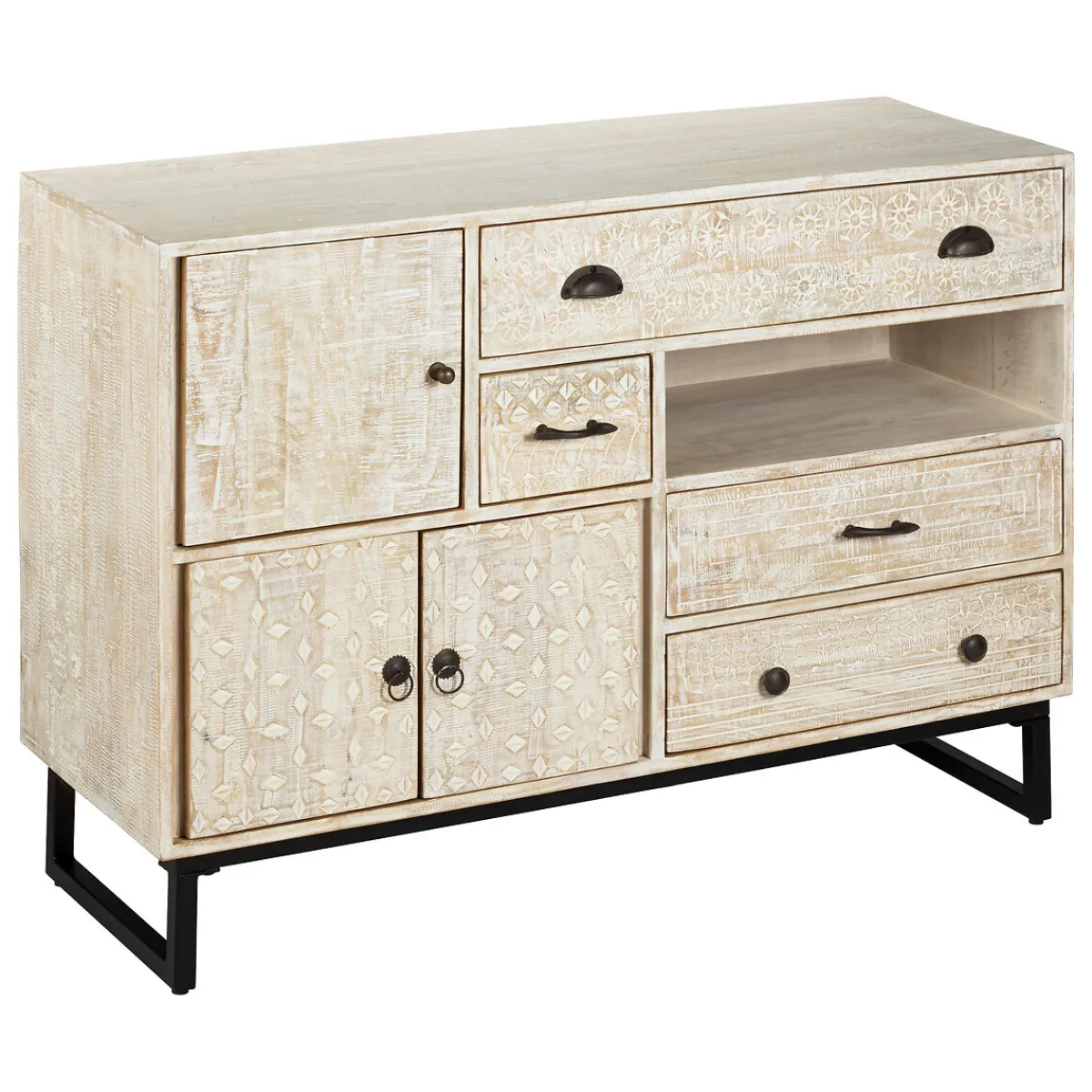 Comme tous les meubles de cette collection, le buffet à portes et tiroirs « Ajay » s’orne de façades décorées de motifs en relief. Tous différents, tiroirs et placards s’ouvrent au moyen d’un assortiment complet de poignées métalliques. Le buffet bas repose sur un piètement en métal.