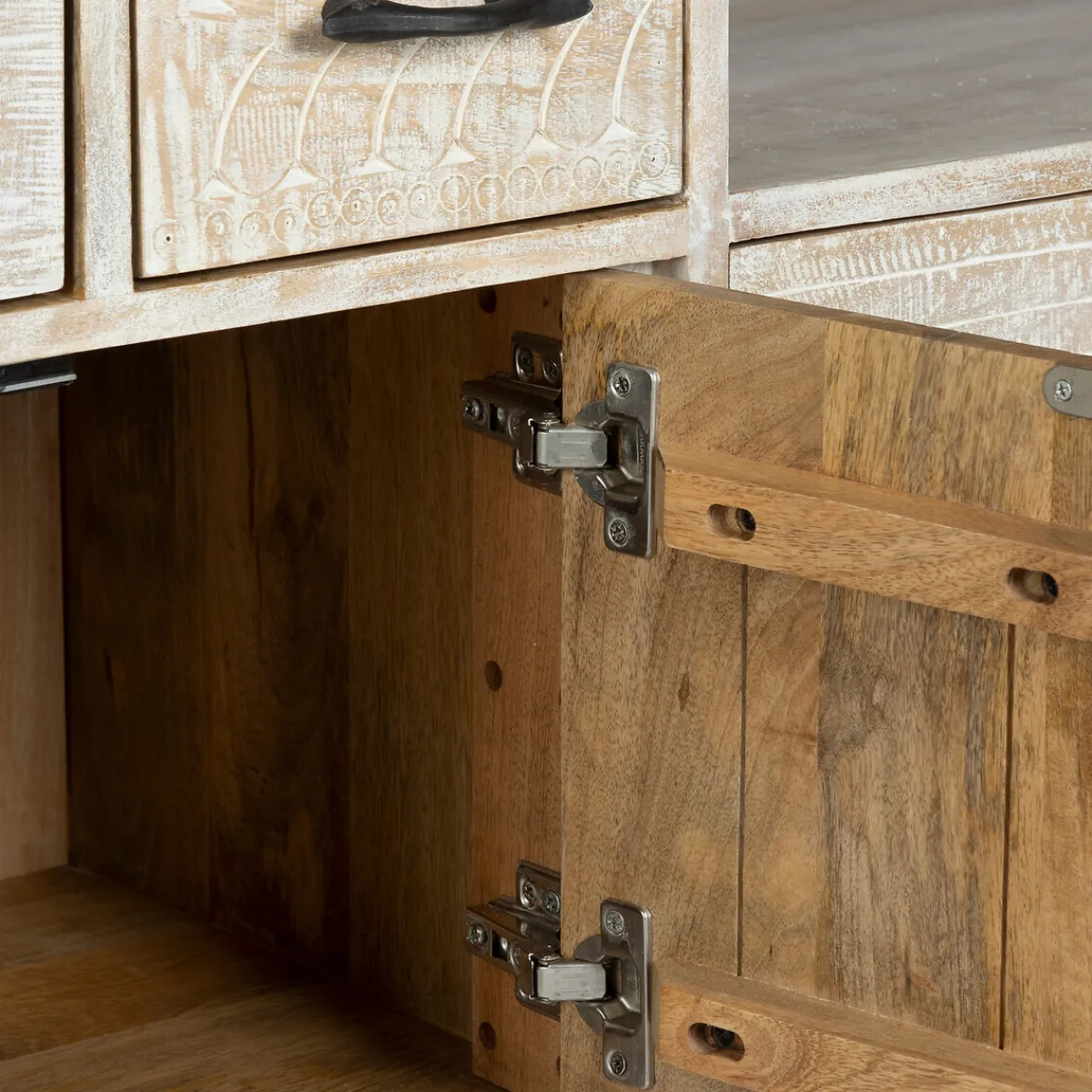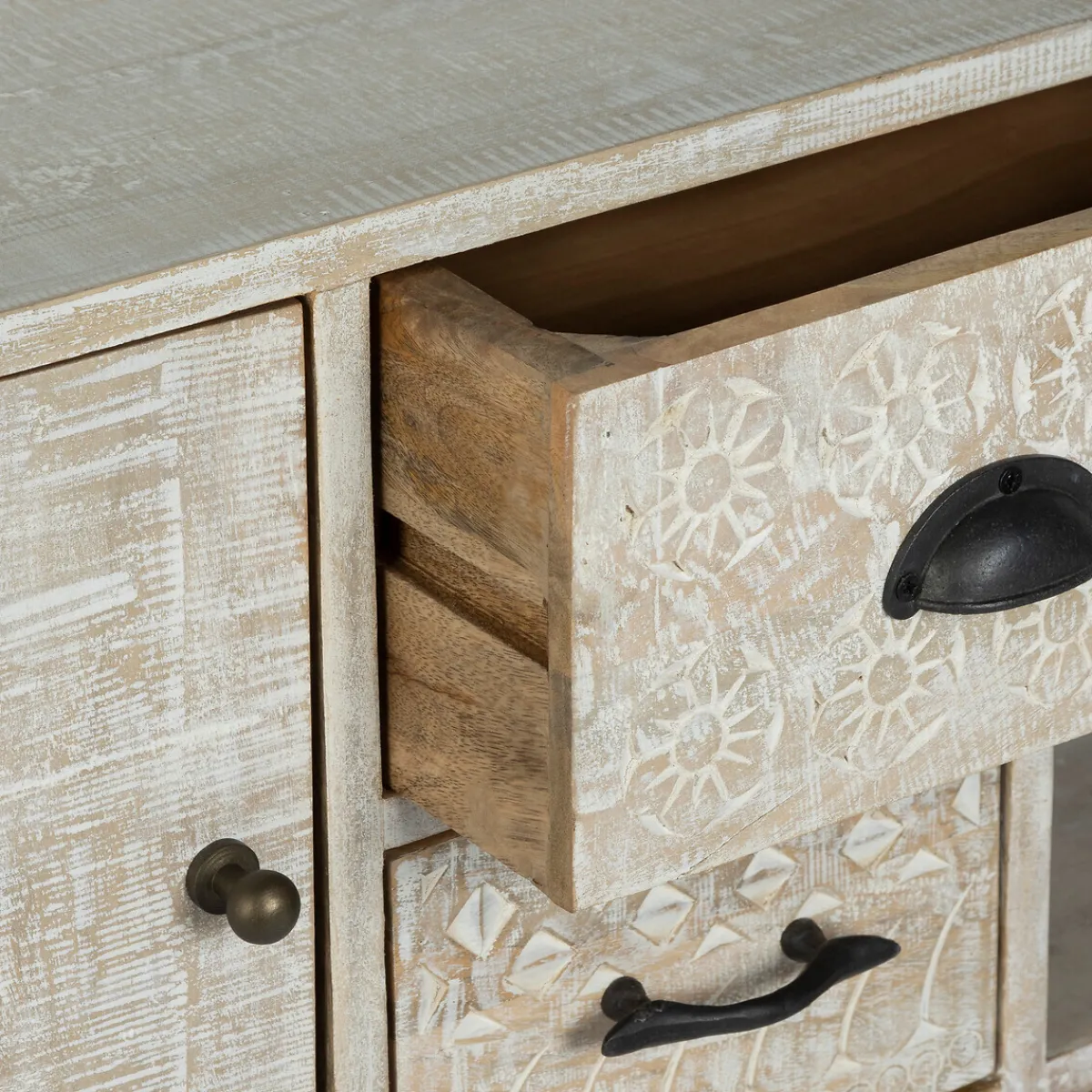 Ce joli bahut sculpté à la main et patiné en Inde, multiplie les rangements.