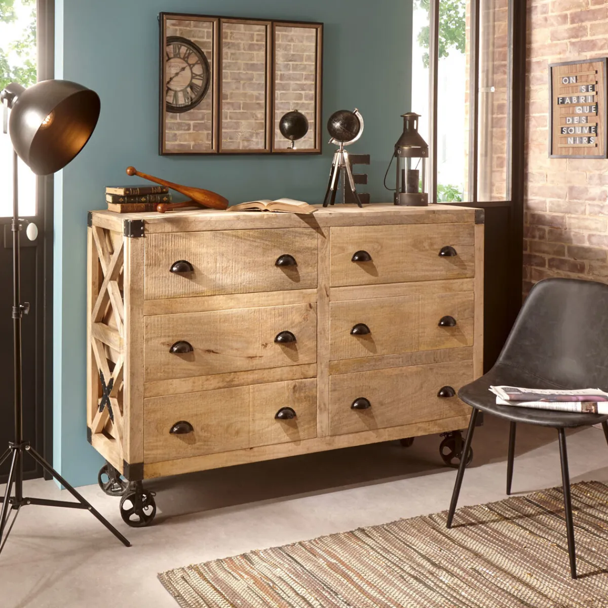 On apprécie le design épuré du buffet « Silas » ainsi que sa praticité. Réalisé en bois de manguier, il est résistant, mais aussi fonctionnel : il est composé de six tiroirs disposés sur des roues en métal.