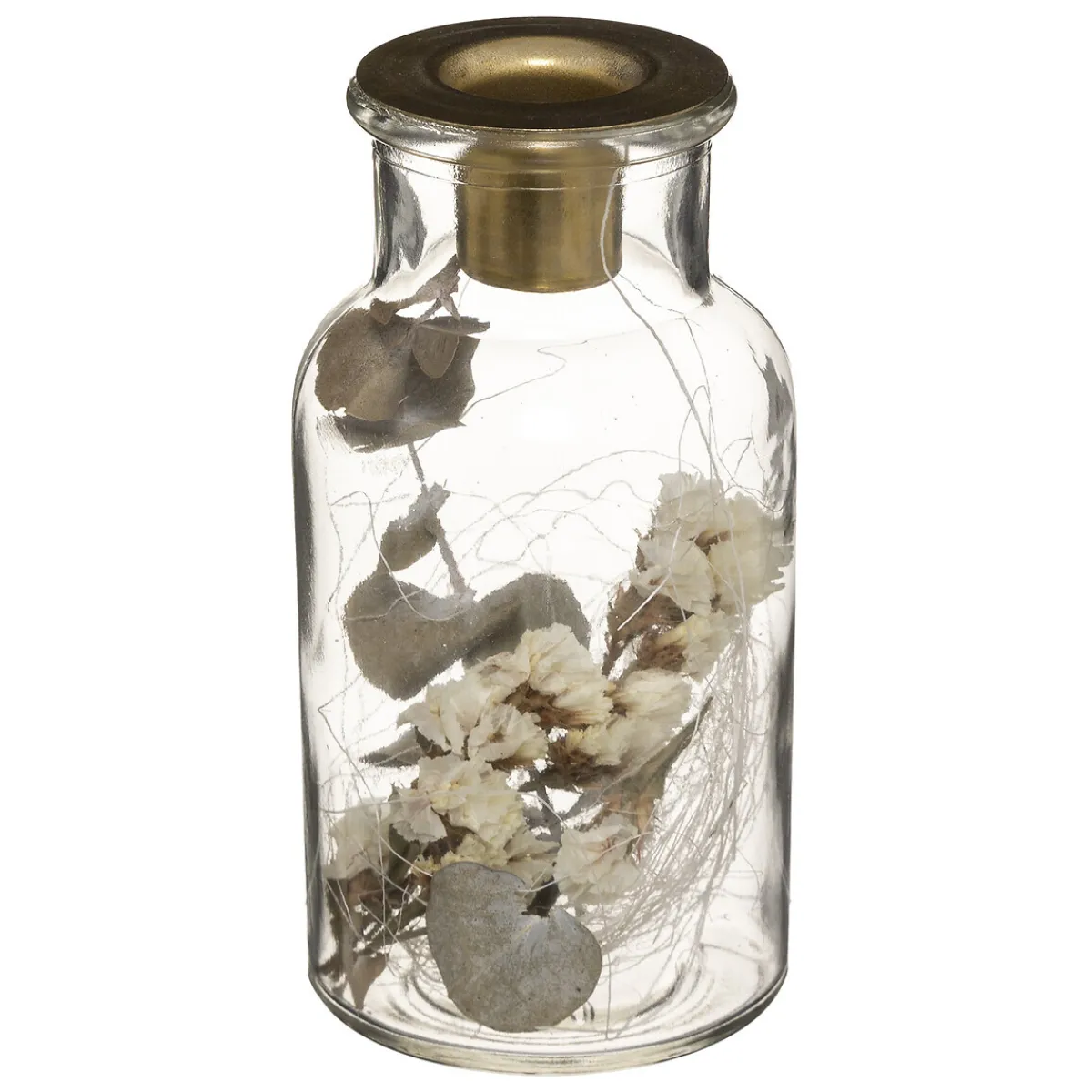 Ce chandelier de fleurs séchées en verre est une véritable trouvaille déco ! Le flacon d’une hauteur de 13 cm accueille une ravissante composition de fleurs séchées, que la transparence du verre permet d’admirer. Le col est équipé d’un bougeoir en métal vieilli destiné à recevoir une bougie, pour un éclairage très chaleureux.