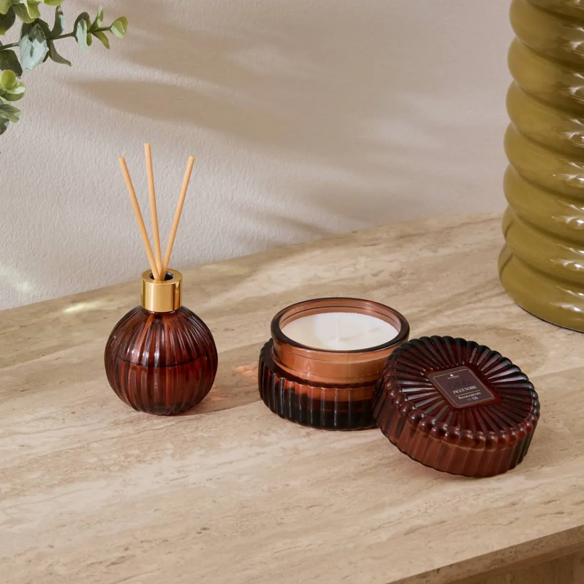 Le coffret sans support Albie Atmosphera est composé d’un diffuseur de parfum en verre teinté ainsi que d’une bougie parfumée*, placée dans un contenant cylindrique en verre strié. Le diffuseur de parfum est équipé de bâtonnets en rotin et l’ensemble sera du meilleur effet une fois réparti sur une étagère ou une table basse.