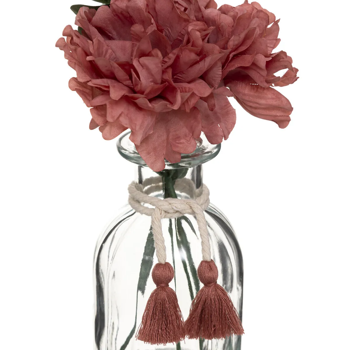 Placée dans un vase en verre transparent, la composition florale « Carmen » est déclinée dans plusieurs tonalités. Haute de 30 cm, elle est constituée des répliques d’une fleur et de feuillage d’eucalyptus. Le col du vase est agrémenté d’une corde tressée, finie par des pampilles assorties aux pétales de fleurs… Une harmonie très poétique !