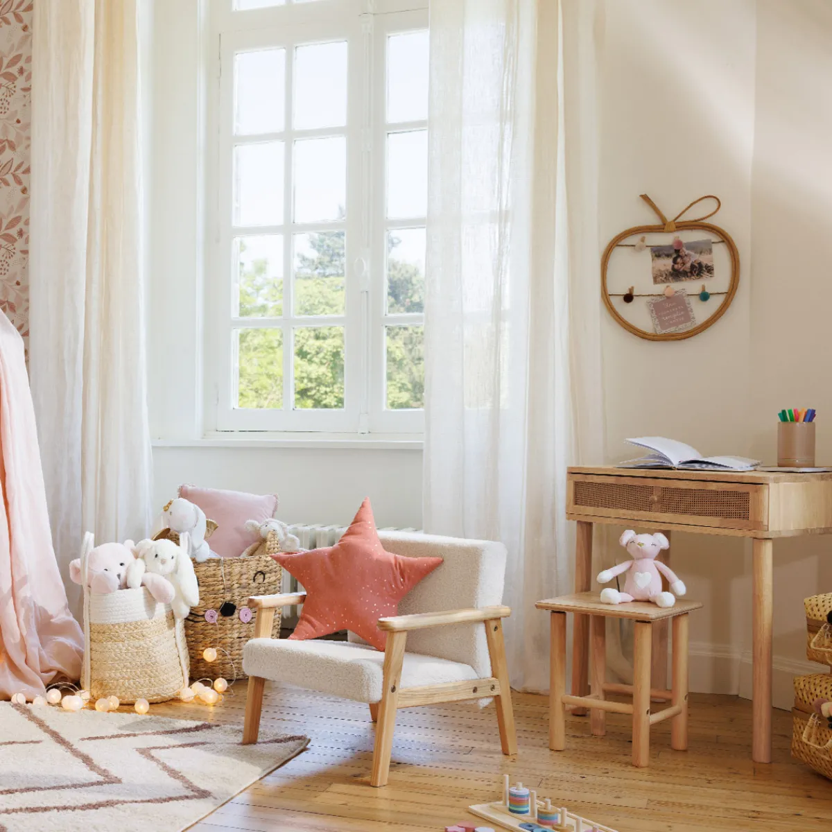 Pour une chambre cosy, posez le coussin enfant « Berlingot » étoile sur un fauteuil en rotin Atmosphera for kids.