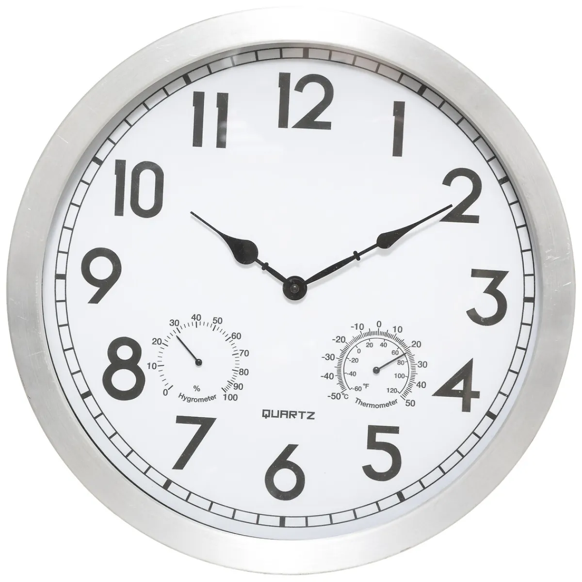 Cette horloge d’extérieur de 40 cm de diamètre est réalisée en aluminium brossé et offre un cadre vitré. Équipée d’un mécanisme silencieux, elle dispose d’un hygromètre et d’un thermomètre. Sobre et contemporaine, cette horloge fonctionne grâce à des piles. Vous pourrez la fixer facilement au mur sur une terrasse.