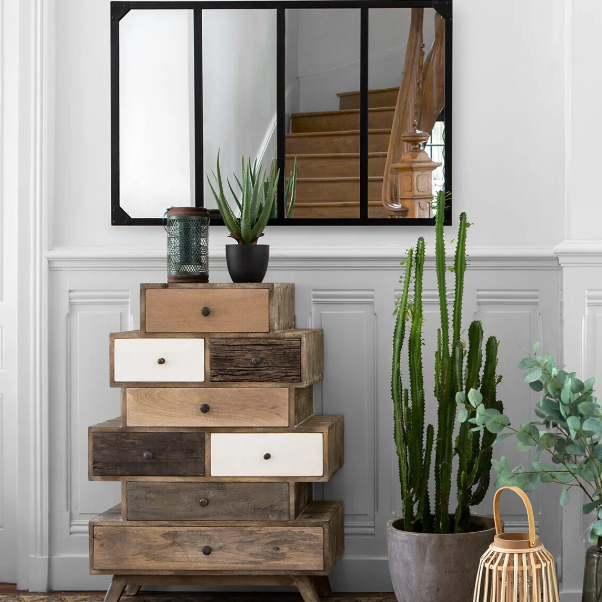 Accentuez l’ambiance récup en installant le miroir « Lola » près d’une table en bois éclairée par plusieurs luminaires bas en métal Atmosphera.