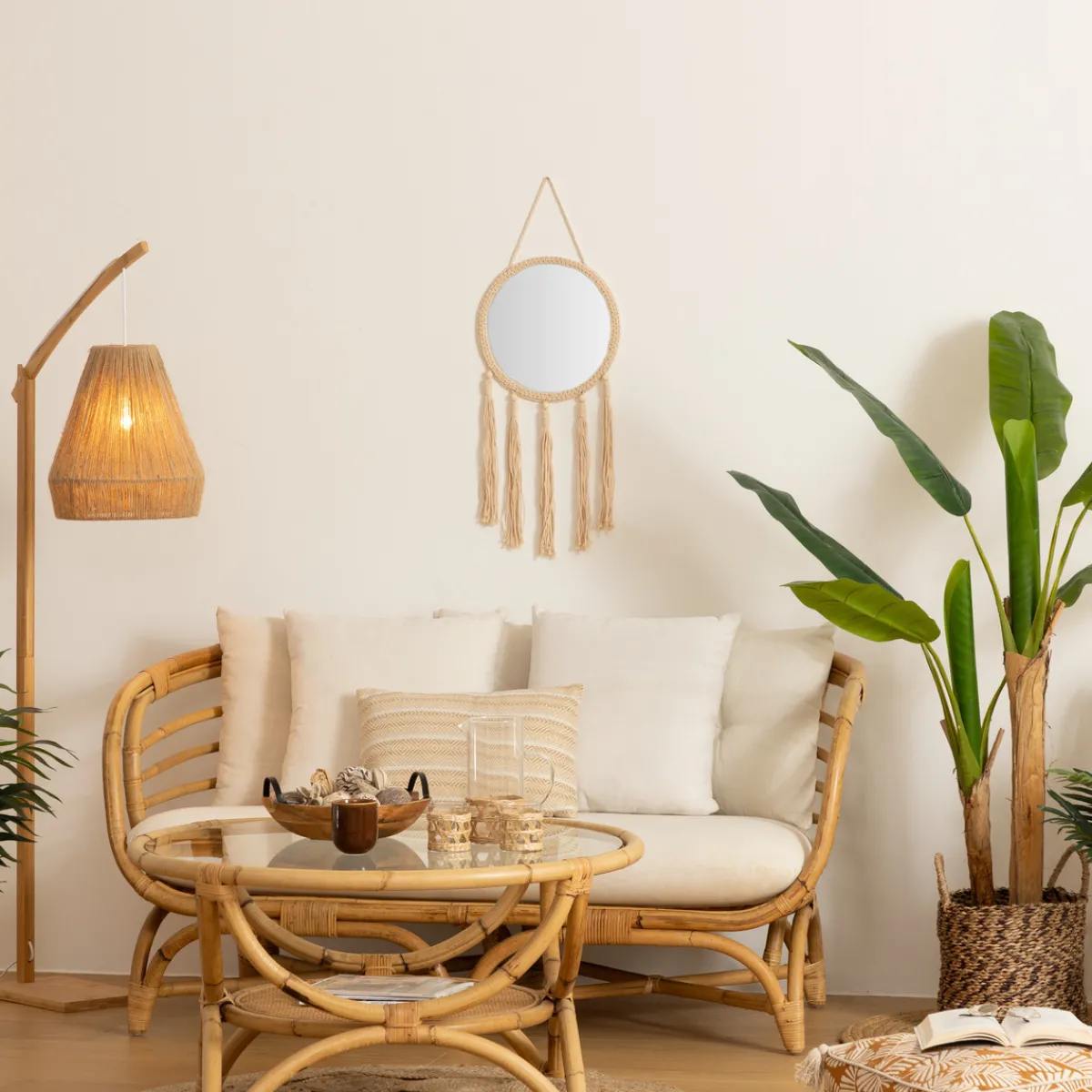 Ce miroir « Diana » a été réalisé en matière naturelles. L’entourage de la structure et les franges sont en coton. Les petites boules sont en bois de peuplier. L’ensemble affiche ainsi une belle harmonie de matières intéressante à mêler à d’autres objets décoratifs en matières brutes.