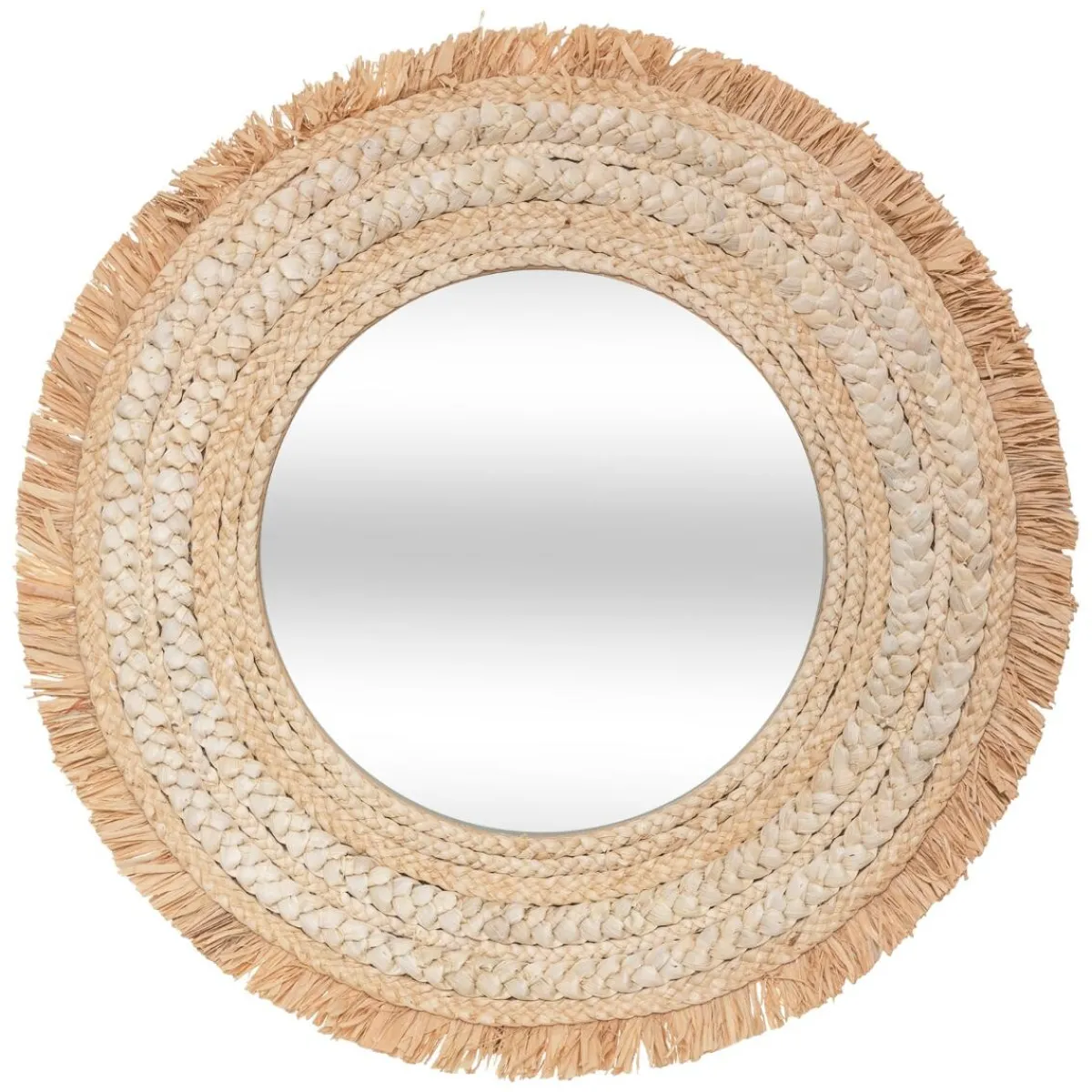 Le miroir « Celia » se distingue par son encadrement réalisé avec des tresses de différentes tailles, travaillées en raphia tantôt plat et tantôt en relief. Les bords frangés ajoutent encore à son charme.