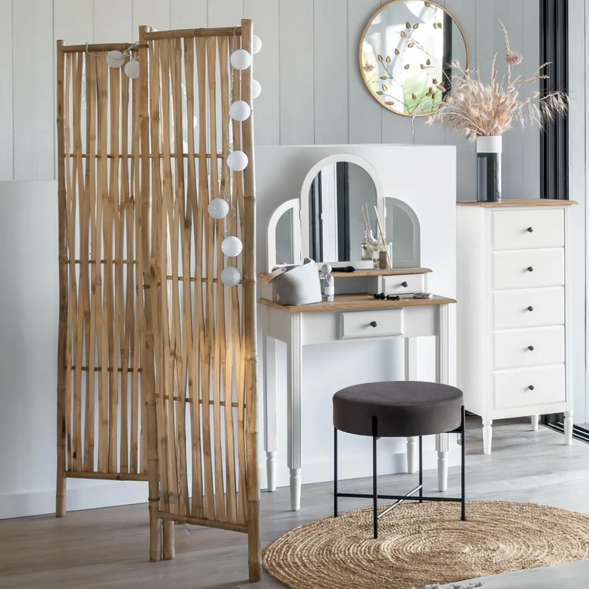 Composé de 3 panneaux en bambou naturel tressé articulés par des liens discrets, cet élégant paravent « Dream » au style bohème trouvera aisément sa place dans une chambre ou une entrée.