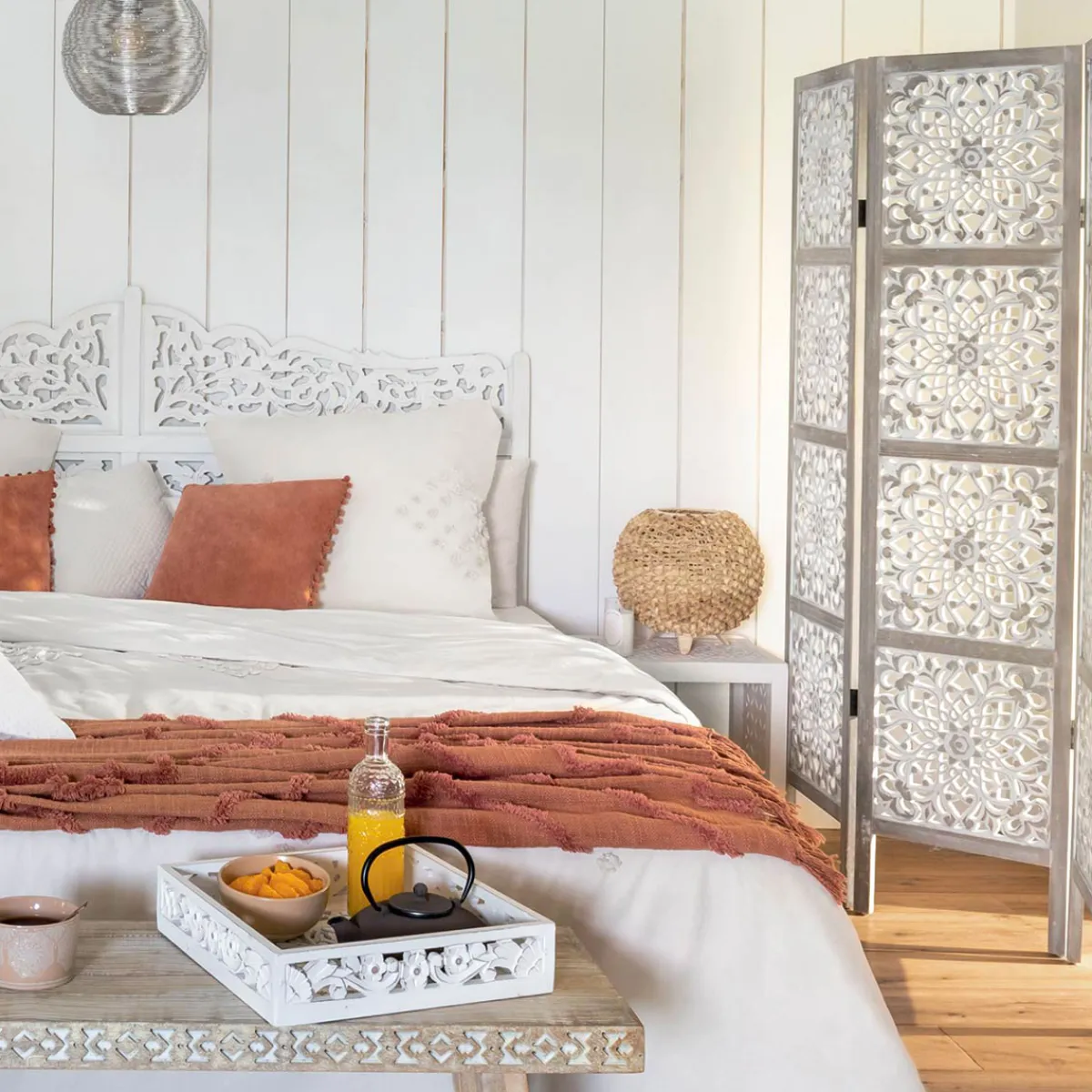 Ce paravent est pratique pour délimiter l’espace et structurer le volume dans la pièce de votre choix : chambre à coucher, salon, etc. Il s’offre une finition blanchie façon bois cérusé qui sublime ses trois panneaux aux motifs venus d’ailleurs.