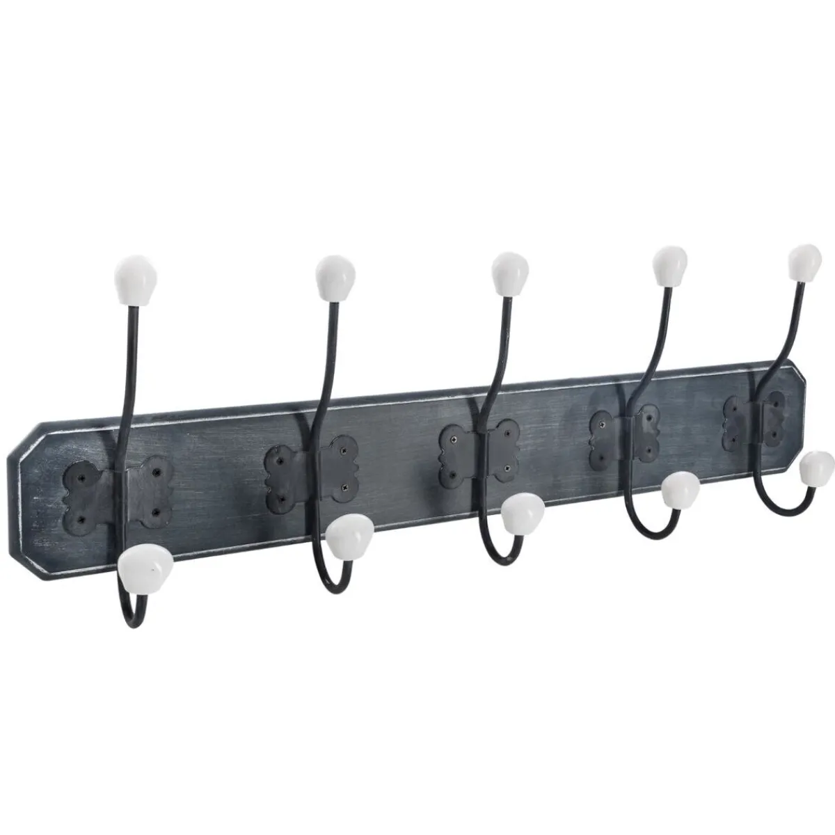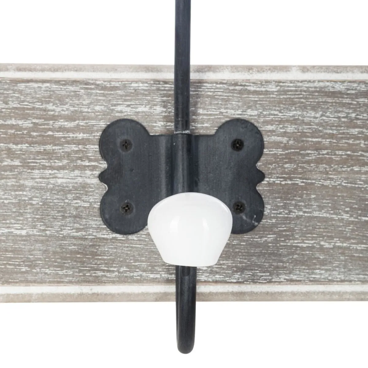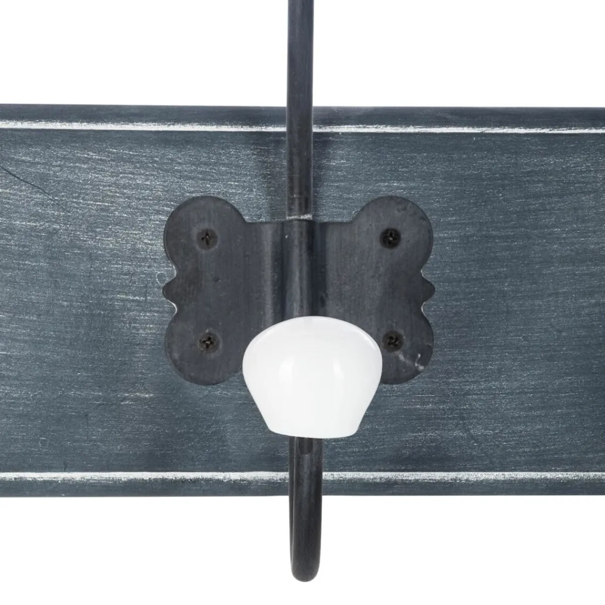 Fixés sur une planche à coins coupés, les crochets doubles en métal sont maintenus par des charnières ornementales papillon en acier vieilli. Ils sont finis de boules en céramique contrastée, douces avec vos chapeaux, écharpes et vêtements.