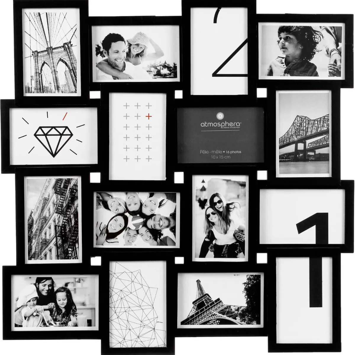 Composé de 16 cadres vitrés en bois de pin teinté, ce pêle-mêle « gael » offre de grandes dimensions et vous permettra d’exposer vos photos préférées aux formats portrait et paysage. Savamment enchevêtrés les uns dans les autres, ces cadres forment un ensemble au design très contemporain.