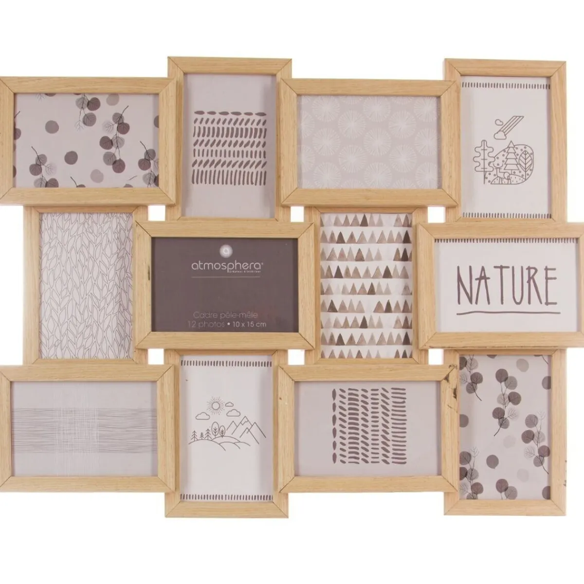 Composé de 12 cadres en bois vitrés et superposés les uns aux autres dans un style très artisanal, ce pêle-mêle offre des dimensions généreuses de 59,5 cm de large pour 45,5 cm de haut. Placez vos souvenirs de voyage dans les cadres et profitez d’une ambiance propice à l’évasion!