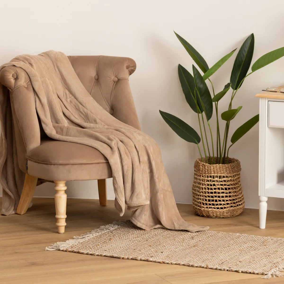 Associez ce plaid uni en flanelle à une table de chevet et un luminaire en bois Atmosphera pour un style authentique.
