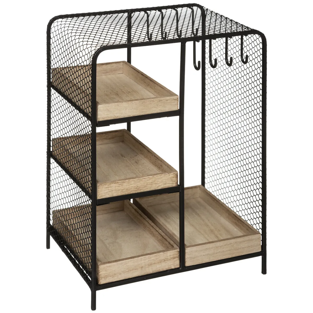 Avec ses dimensions généreuses, ce porte-bijoux « Arty » vous permettra de ranger vos bijoux avec style! Réalisé dans un mélange de bois et de métal grillagé, il dispose de 4 étagères et de 8 crochets pour suspendre vos colliers. Idéal dans une chambre à coucher, il se mariera volontiers avec du bois.