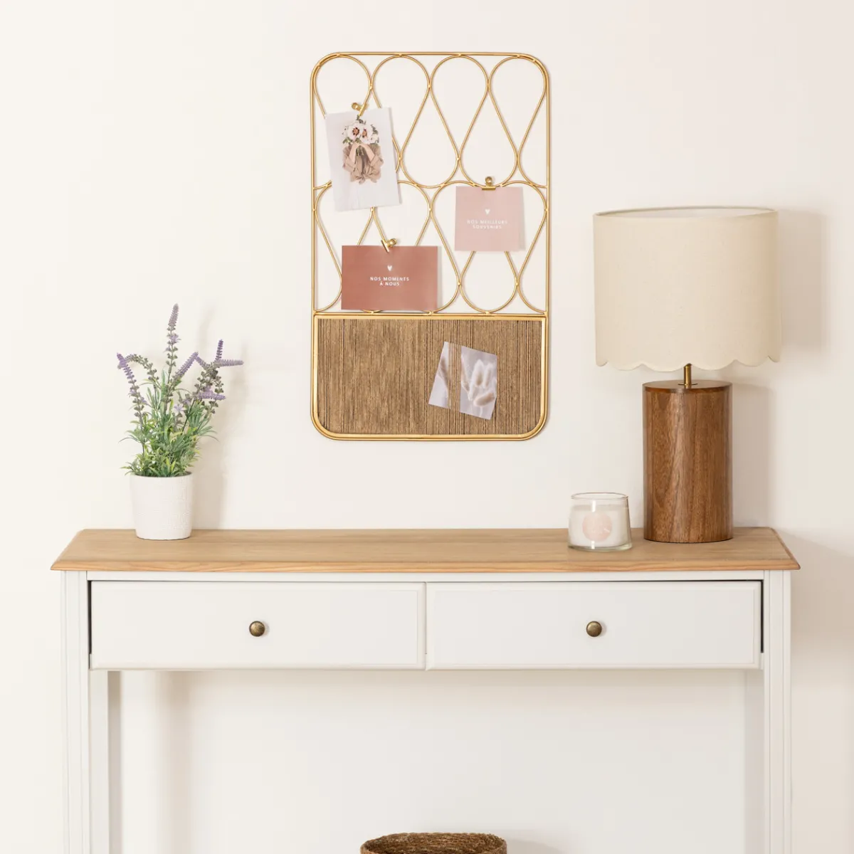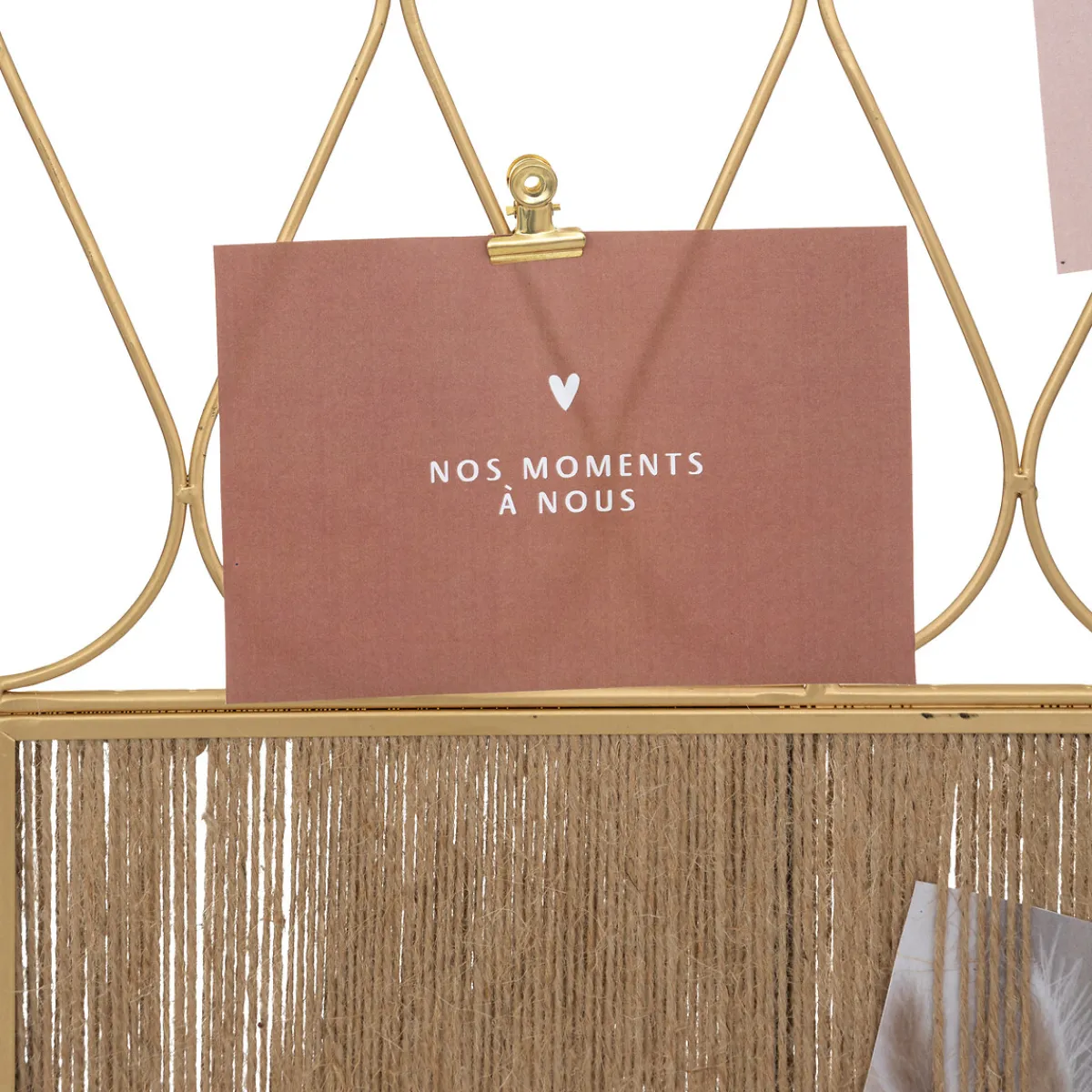 Imaginé dans un mélange de métal doré et de corde en jute naturelle, le porte-photo « Lindsay » offre des motifs délicats et des dimensions harmonieuses. Doté de 5 pinces à dessin pour fixer des photos, vous pourrez également glisser des cartes dans entre les fils de corde. Idéal pour réchauffer l’ambiance d’une entrée ou d’une chambre!
