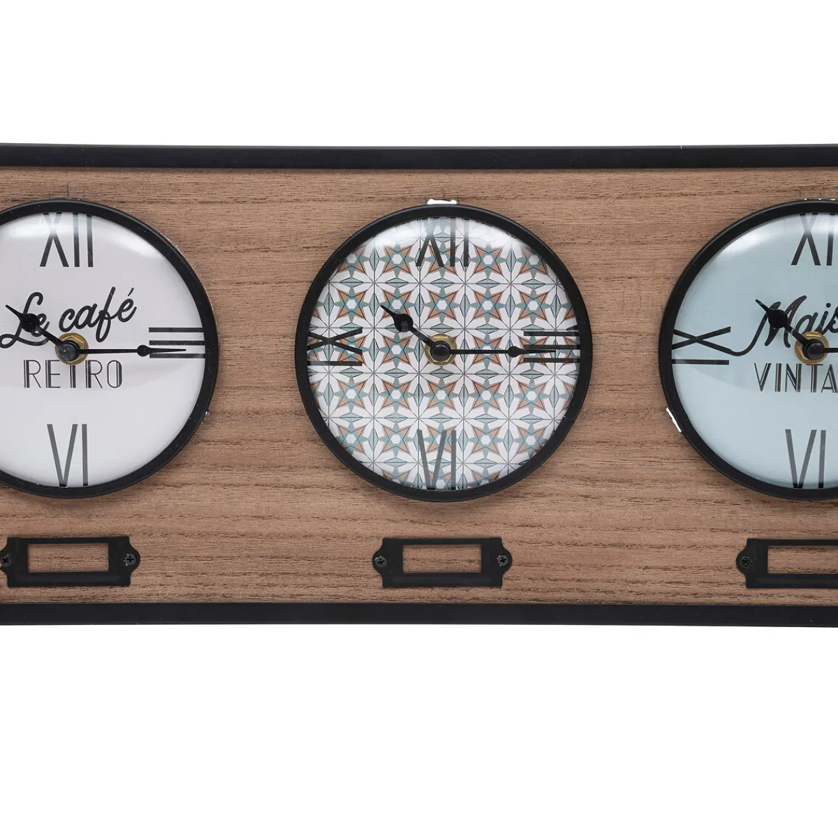 Réalisée dans un mélange chaleureux de bois et de métal cette horloge offre 3 cadrans vitrés dont les fonds sont décorés de motifs différents. Des emplacements métalliques pour étiquettes, placés sous chaque horloge, vous permettront d’indiquer l’heure de plusieurs villesdu monde!
