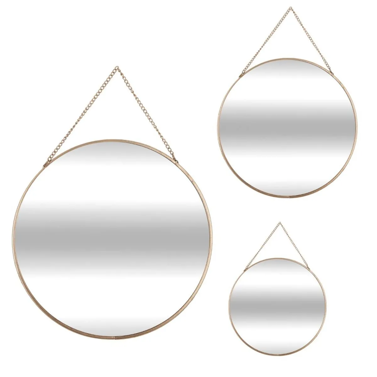 Suspendus à une chaînette métallique, les 3 miroirs ronds sont de tailles assorties et cerclés de métal dont vous pourrez choisir la finition. Disposez-les en groupe sur un mur du salon, de l’entrée ou de la chambre.